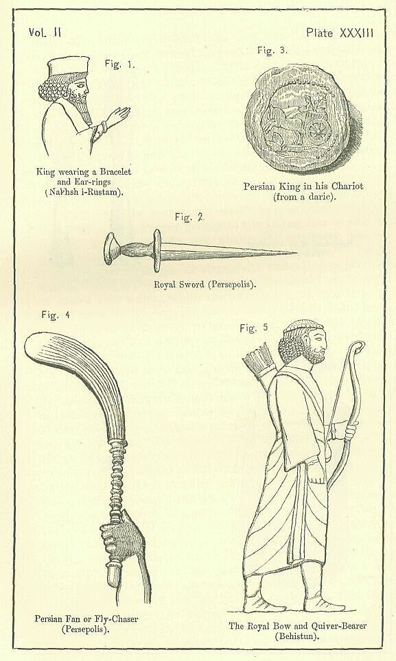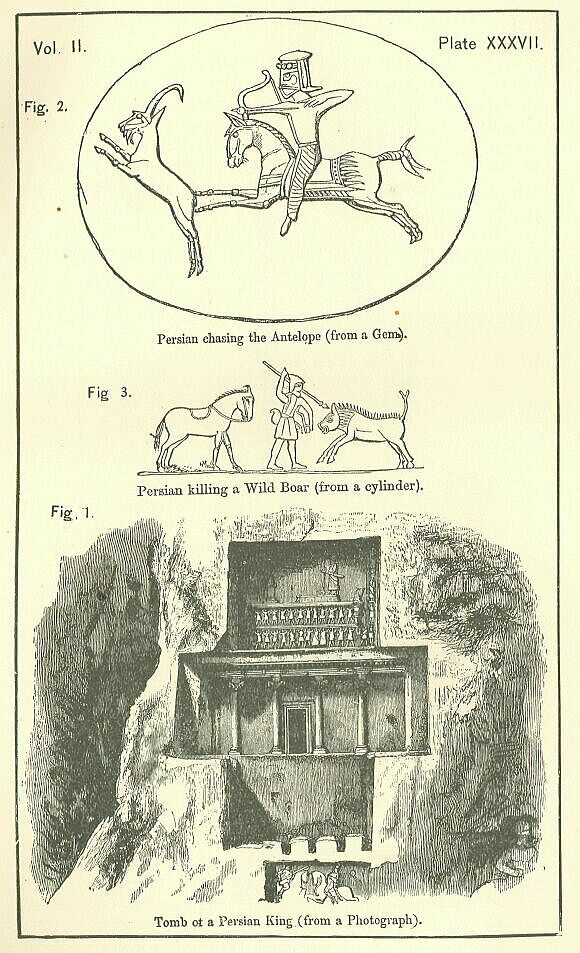 It is in these regions, which combine facility of defence with pleasantness of climate, that the principal cities of the district have at all times been placed. The earliest known capital of the region was Pasargadae, or Persagadae, as the name is sometimes written, of which the ruins still exist near Murgab, in lat. 30° 15’ long. 53° 17’. Here is the famous tomb of Cyrus, whereof a description will be given hereafter; and here are also other interesting remains of the old Persian architecture. Neither the shape nor the extent of the town can be traced. The situation was a plain amid mountains, watered by small streams which found their way to a river of some size (the Pulwar) flowing at a little distance to the west. [PLATE XXVII Fig. 1.]