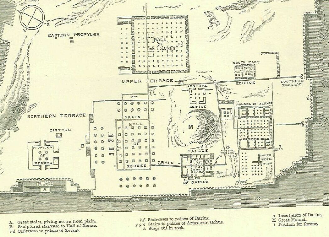 At the distance of thirty miles from Pasargadae, or of more than forty by the ordinary road, grew up the second capital, Persepolis, occupying a more southern position than the primitive seat of power, but still situated towards the edge of the plateau, having the mountain-barrier to the south-west and the desert at no great distance to the north-east. Like its predecessor, Persepolis was situated in a plain, but in a plain of much larger dimensions and of far greater fertility. The plain of Merdasht is one of the most productive in Persia, being watered by the two streams of the Bendamir and the Pulwar, which unite a few miles below the site of the ancient city. From these two copious and unfailing rivers a plentiful supply of the precious fluid can at all times be obtained; and in Persia such a supply will always create the loveliest verdure, the most abundant crops, and the richest and thickest foliage. The site of Persopolis is naturally far superior to that in which the modern provincial capital, Shiraz, has grown up, at about the same distance from Persepolis as that is from Pasargadae. and in the same—i.e. in a south-west—direction.