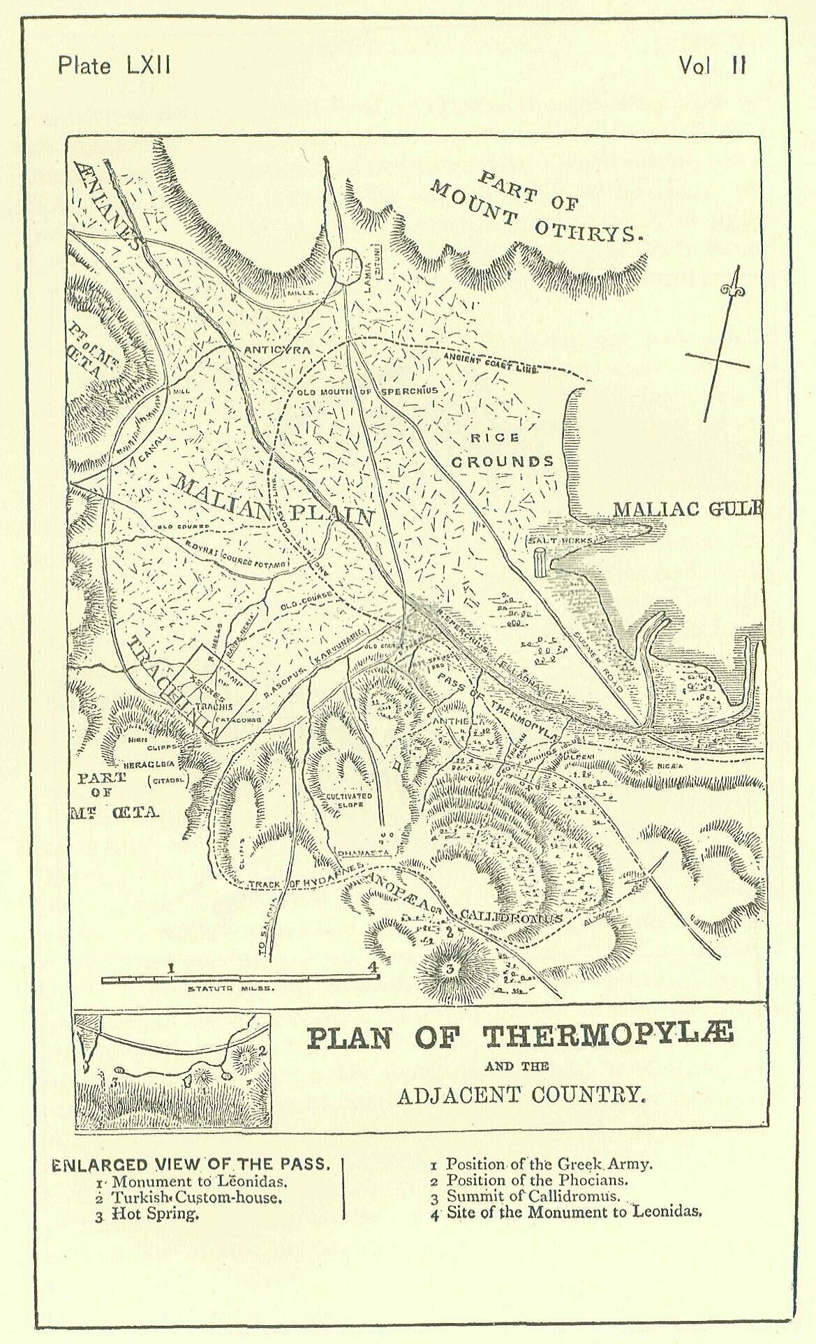 Thus far had the Greeks allowed the invader to penetrate their country without offering him any resistance. Originally there had been an intention of defending Thessaly, and an army under Evsenetus, a Spartan polemarch, and Themistocles, the great Athenian, had proceeded to Tempe, in order to cooperate with the Thessalians in guarding the pass. But the discovery that the Olympic range could be crossed in the,place where the army of Xerxes afterwards passed it had shown that the position was untenable; and it had been then resolved that the stand should be made at the next defensible position, Thermopylae. [PLATE LXII.] Here, accordingly, a force was found—small, indeed, if it be compared with the number of the assailants, but sufficient to defend such a position as that where it was posted against the world in arms. Three hundred Spartans, with their usual retinue of helots, 700 Lacedaemonians, other Peloponnesians to the number of 2800, 1000 Phocians, the same number of Locrians, 700 Thespians, and 400 Thebans, formed an army of 9000 men—quite as numerous a force as could be employed with any effect in the defile they were sent to guard. The defile was a long and narrow pass shut in between a high mountain, Callidromus, and the sea, and crossed at one point by a line of wall in which was a single gateway. Unless the command of the sea were gained, or another mode of crossing the mountains discovered, the pass could scarcely be forced.