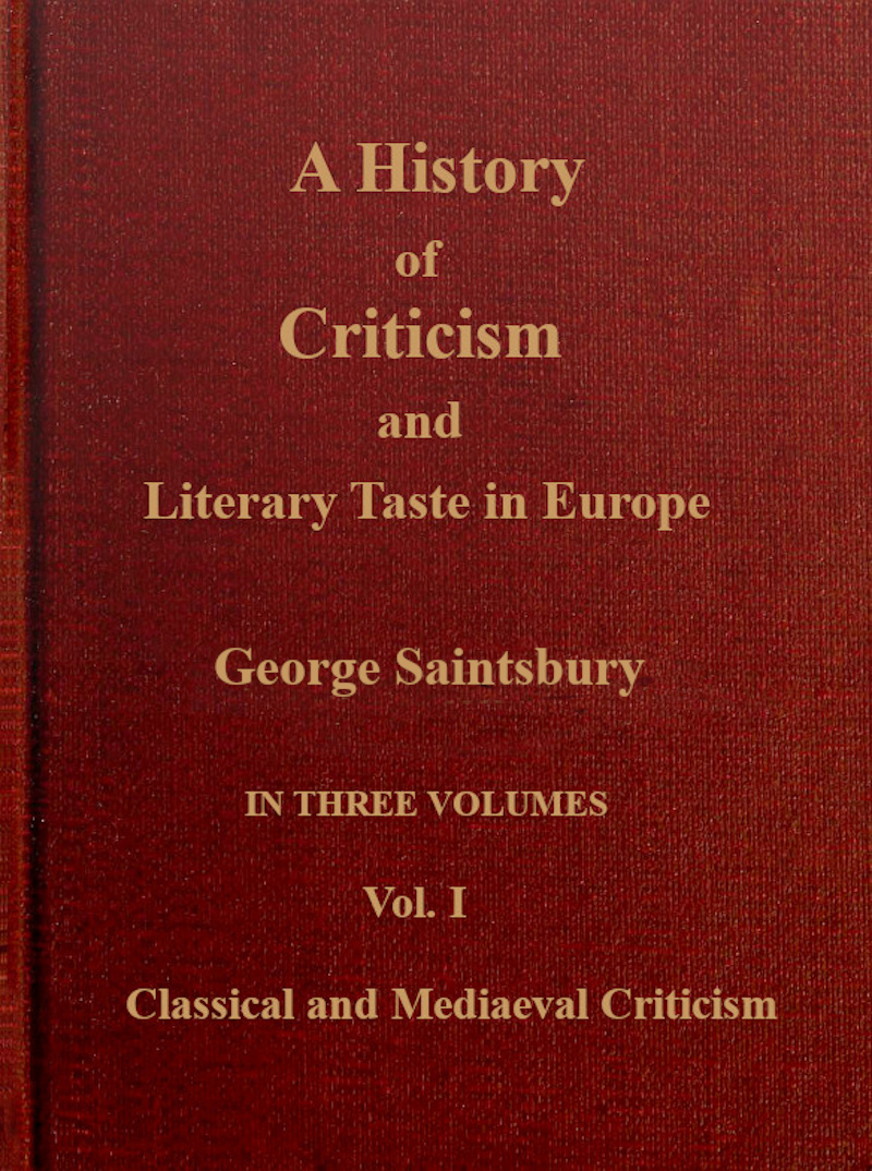 It is perhaps vain to attempt to tone down the audacity of the present essay by any explanations or limitations; it is certain that those who are offended by it at first blush are very unlikely to be propitiated by excuses of the faults which, excusably or inexcusably, it no doubt contains. The genesis of it is as follows. When, not much less than thirty years ago, the writer was first asked to undertake the duty of a critic, he had naturally to overhaul his own acquaintance with the theory and practice of criticism, and to inquire what was the acquaintance of others therewith. The disconcerting smallness of the first was a little compensated by the discovery that very few persons seemed to be much better furnished. Dr Johnson’s projected “History of Criticism, as it relates to Judging of Authours” no doubt has had fellows in the great library of books unwritten. But there were then, and I believe there are still, only two actual attempts to deal with the whole subject. One of these[1] I have never seen, and indeed had vinever heard of till nearly the whole of the present volume was written. Moreover, it seems to be merely a torso. The other, Théry’s Histoire des Opinions Littéraires,[2] a book which, after two editions at some interval, has been long out of print, is a work of great liveliness, no small knowledge, and, in its airy French kind, a good deal of acuteness. But the way in which “Critique Arabe,” “Critique Juive,” &c., are knocked off in a page or a paragraph at one end, and the way in which, at the other—though the second edition was published when Mr Arnold was just going to write, and the first when Coleridge, and Hazlitt, and Lamb had already written—the historian knows of nothing English later than Campbell and Blair, are things a little disquieting. At any rate, neither of these was then known to me, and I had, year by year, to pick up for myself, and piece together, the greater and lesser classics of the subject in a haphazard and groping fashion.