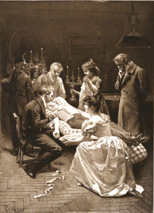 He paced gravely up and down his old salon, furnished in the style of Louis XV., halting sometimes before a door surmounted by nude Cupids in fresco, who led in chains of flowers well-bred fawns and good-natured wild boars; sometimes before a panel overladen with paltry, over-elaborated sculpture, whose tortuous vagaries and endless intertwining the eye would have wearied itself to no purpose in attempting to follow. But these vague and fleeting distractions did not prevent the colonel, whenever he turned about, from casting a keen and searching glance at the two companions of his silent vigil, resting upon them alternately that watchful eye which for three years past had been standing guard over a fragile and priceless treasure, his wife.