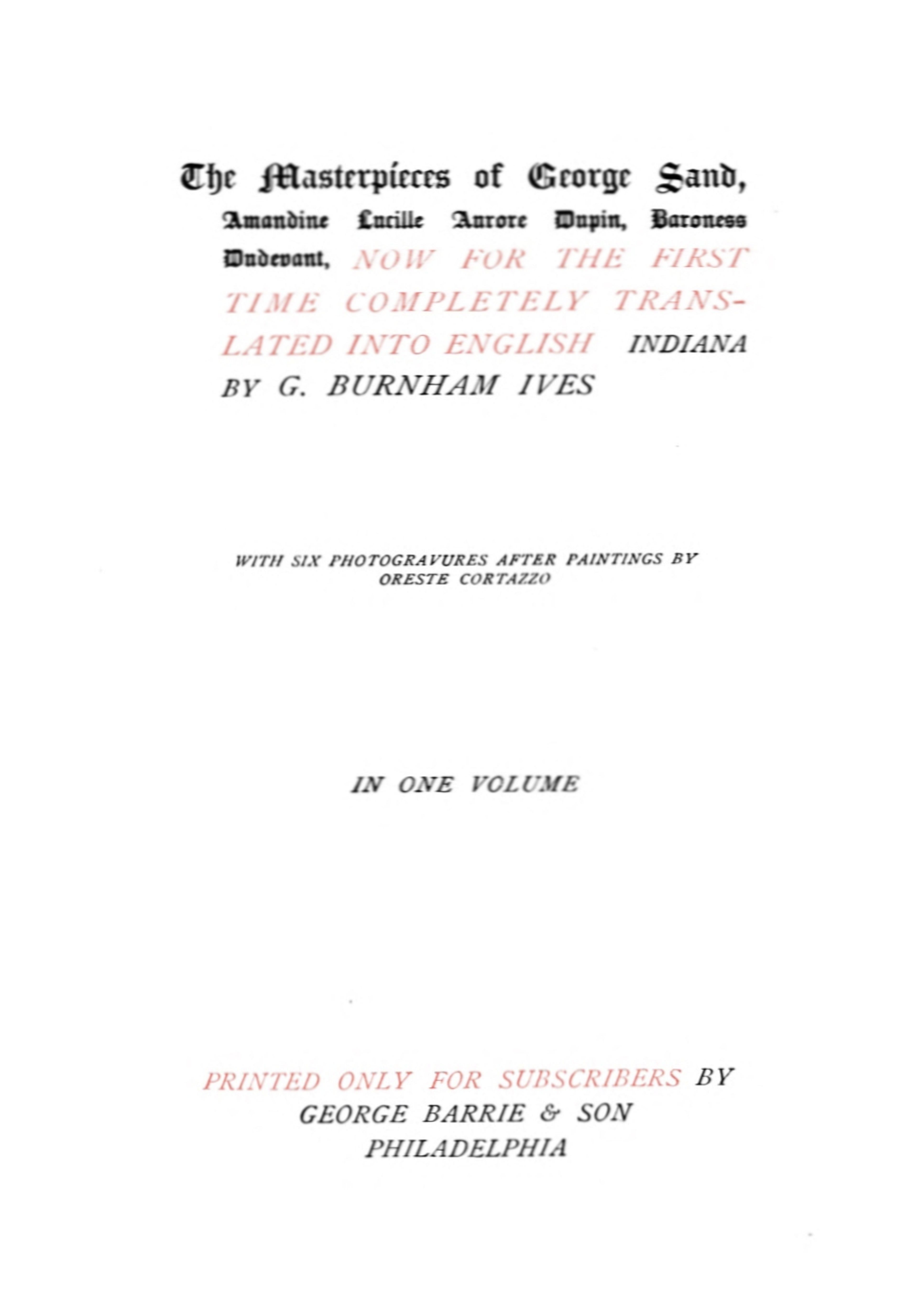 To-day therefore, having re-read the first novel of my youth with as much severity and impartiality as if it were the work of another person, on the eve of giving it a publicity which it has not yet derived from the popular edition, having resolved beforehand not to retract—one should never retract what was said or done in good faith—but to condemn myself if I should discover that my former tendencies were mistaken or dangerous, I find myself so entirely in accord with myself with respect to the sentiment which dictated Indiana and which would dictate it now if I had that story to tell to-day for the first time, that I have not chosen to change anything in it save a few ungrammatical sentences and some inappropriate words. Doubtless many more of the same sort remain, and the literary merits of my writings I submit without reserve to the animadversions of the critics; I gladly accord to them all the competence in that regard which I myself lack. That there is an incontestable mass of talent in the daily press of the present day, I do not deny and I delight to acknowledge it. But that there are many philosophers and moralists in this array of polished writers, I do positively deny, with due respect to those who have condemned me, and who will condemn me again on the first opportunity, from their lofty plane of morality and philosophy.
