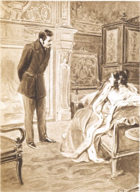 "It was then, my poor child," I said, "that I made your acquaintance. I was living in the same house. The story of your accident aroused my interest. Soon I learned that you were young and worthy of a serious attachment; that Leoni, after treating you with great brutality, had abandoned you when you were critically ill and in want. I desired to see you; you were delirious when I approached your bed. O, Juliette, how lovely you were, with your bare shoulders, your dishevelled hair, your lips burning with the fire of fever, and your face animated by the excitement of suffering! How lovely you still seemed to me when, prostrated by fatigue, you fell back on your pillow, pale and drooping, like a white rose shedding its leaves in the hot sun of midday! I could not tear myself away from you. I felt a thrill of irresistible sympathy; I was impelled by such a deep interest as nobody had ever aroused in me. I sent for the leading physicians of the city; I procured for you all the comforts that you lacked. Poor deserted girl! I passed whole nights by your bedside, I saw your despair, I understood your love. I had never loved; it seemed to me that no woman was capable of returning the passion that I was capable of feeling. I sought a heart as fervent as mine. I distrusted all those that I put to the test, and I soon realized the prudence of my self-restraint when I saw the coldness and frivolity of the hearts of those women. Yours seemed to me the only one capable of understanding me. A woman who could love and suffer as you had done was the realization of all my dreams. I desired to obtain your affection, but without much hope of success. What gave me the presumption to try to console you was my absolute certainty that I loved you sincerely and generously. All that you said in your delirium taught me to know you just as well and thoroughly as our subsequent intimacy has done. I knew that you were a sublime creature from the prayers that you addressed to God, aloud, in a tone of which no words can describe the heart-rending purity. You prayed for forgiveness for Leoni, always forgiveness, never vengeance! You invoked the souls of your parents; you described to them breathlessly the misfortunes by which you had expiated your flight and their sorrow. Sometimes you took me for Leoni, and poured out crushing reproaches upon me; at other times you thought that you were with him in Switzerland, and you embraced me passionately. It would have been easy for me then to abuse your error, and the love that was gaining headway in my breast made your frantic caresses a veritable torture. But I would have died rather than yield to my desires, and the villainy of Lord Edwards, of which you talked constantly, seems to me the most degrading infamy of which a man could be guilty. At last I had the good fortune to save your life and your reason, my dear Juliette. Since then I have suffered bitterly, and I have been very happy through you. I am a fool perhaps not to be content with the friendship and the possession of such a woman as you, but my love is insatiable. I long to be loved as Leoni was, and I torment you with that foolish ambition. I have not his eloquence and his fascinations, but I love you. I have not deceived you; I will never deceive you. It is time for your heart, so long shattered by fatigue, to find rest while sleeping on mine. Juliette! Juliette! when will you love me as you are capable of loving?"