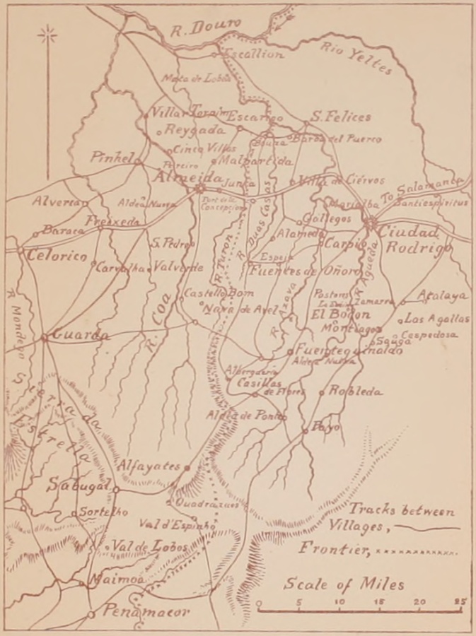 But although the regiment was composed of three battalions, it never mustered more than seventeen companies in the Peninsula, and at Waterloo only fourteen were present. It took its share not only in the general actions, sieges, and stormings in common with the other regiments, but also was constantly engaged in innumerable "affairs," as they are styled, which caused an unceasing drain on its strength—a drain from which regiments belonging to other Divisions were usually exempt. The reason for this was that the Light Brigade, or, as it was subsequently styled, the Light Division, was used during the campaigns in the Peninsula as a permanent covering or outpost force. Thus in 1810 it acted as a Corps of Observation on the Coa, far in advance of the rest of the army, and took part in the affairs of Barba del Puerco, Gallegos, etc., as well as in the severe fighting at the Combat of the Coa, at which no other troops were engaged. Again, in 1811, Craufurd's Brigade formed the advanced guard in the pursuit of Massena, and hence was constantly in collision with the enemy.