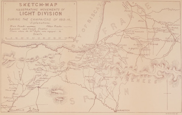[12] Lieutenant-Colonel Beckwith and the Battalion were particularly thanked in Lord Wellington's despatches for their gallant conduct on this trying day, and indeed nothing could exceed the devoted gallantry displayed by every one. The Light Division lost in killed and wounded on this day 27 officers and 336 men; 53 Rifle Men were made prisoner; many of these were also wounded. The French loss must have been very considerable from the immense numbers in the field.—G. S.