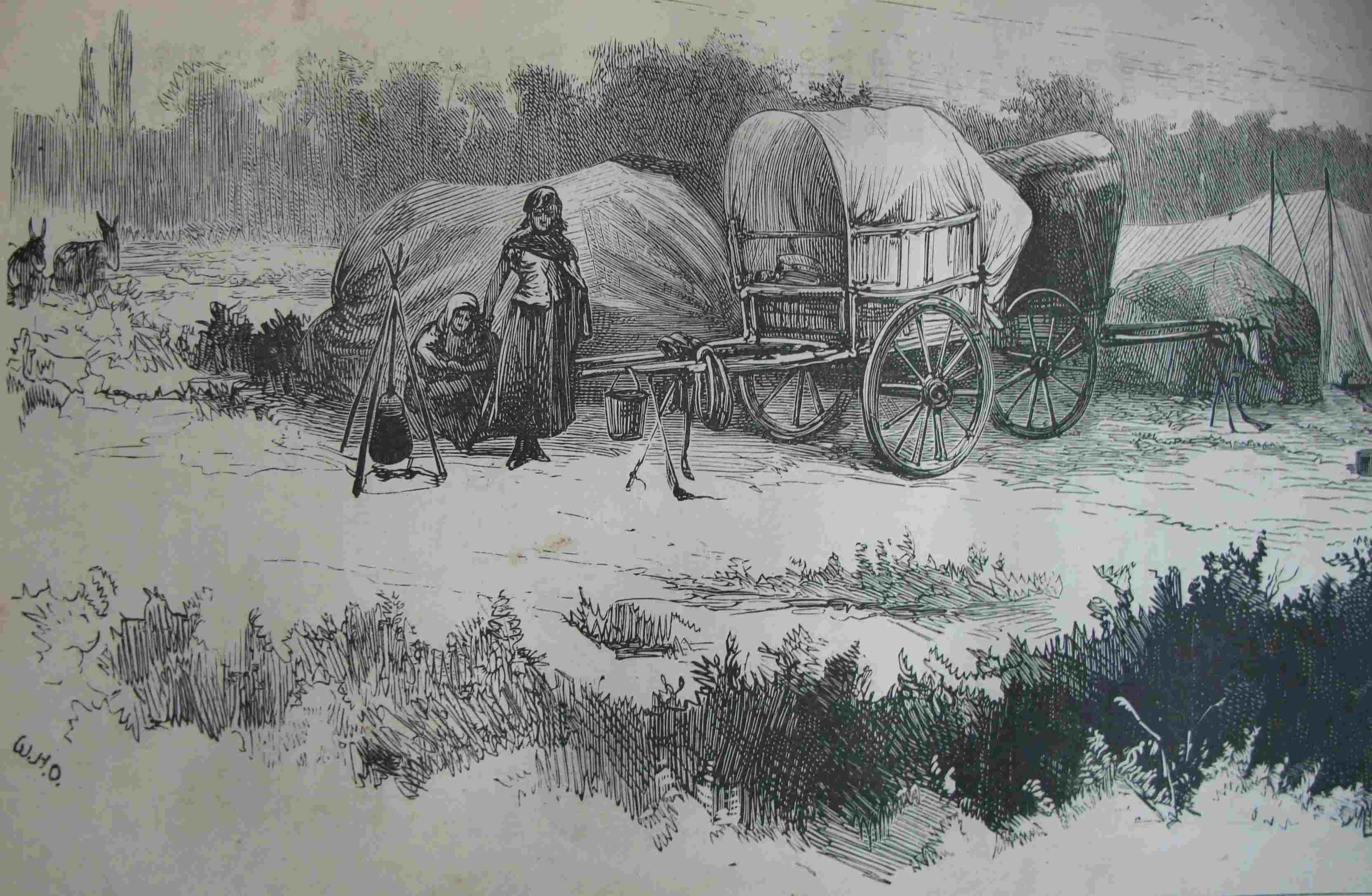 Notwithstanding that edicts have been hurled against them, persecuted and hunted like vermin during the Middle Ages, still they kept coming. Later on, laws more merciful than in former times have taken a more humane view of them and been contented by classing them as “vagrants and scoundrels”—still they came. Magistrates, ministers, doctors, and lawyers have spit their spite at them—still they came; frowning looks, sour faces, buttoned-up pockets, poverty and starvation staring them in the face—still they came. Doors slammed in their faces, dogs set upon their heels, and ignorant babblers hooting at them—still they came; and the worst of it is they are reducing our own “riff-raff” to their level. The novelist has written about them; the preacher has preached against them; the drunkards have garbled them over in their mouths, and yelped out “Gipsy,” and stuttered “scamp” in disgust; the swearer has sworn at them, and our “gutter-scum gentlemen” have told them to “stand off.” These “Jack-o’-th’-Lantern,” “Will-o’-th’-Wisp,” “Boo-peep,” “Moonshine Vagrants,” p. 4“Ditchbank Sculks,” “Hedgerow Rodneys,” of whom there are not a few, are black spots upon our horizon, and are ever and anon flitting before our eyes. A motley crowd of half-naked savages, carrion eaters, dressed in rags, tatters, and shreds, usually called men, women, and children, some running, walking, loitering, traipsing, shouting, gaping, and staring; the women with children on their backs, and in their arms; old men and women tottering along “leaning upon their staffs;” hordes of children following in the rear; hulking men with lurcher dogs at their heels, sauntering along in idleness, spotting out their prey; donkeys loaded with sacks, mules with tents and sticks, and their vans and waggons carrying ill-gotten gain and plunder; and the question arises in the mind of those who take an interest in this singularly unfortunate race of beings: From whence came they? How have they travelled? By what routes did they travel? What is their condition, past and present? How are they to be dealt with in any efforts put forth to improve their condition? These are questions I shall in my feeble way endeavour to solve; at any rate, the two latter questions; the first questions can be dealt better with by abler hands than mine.
