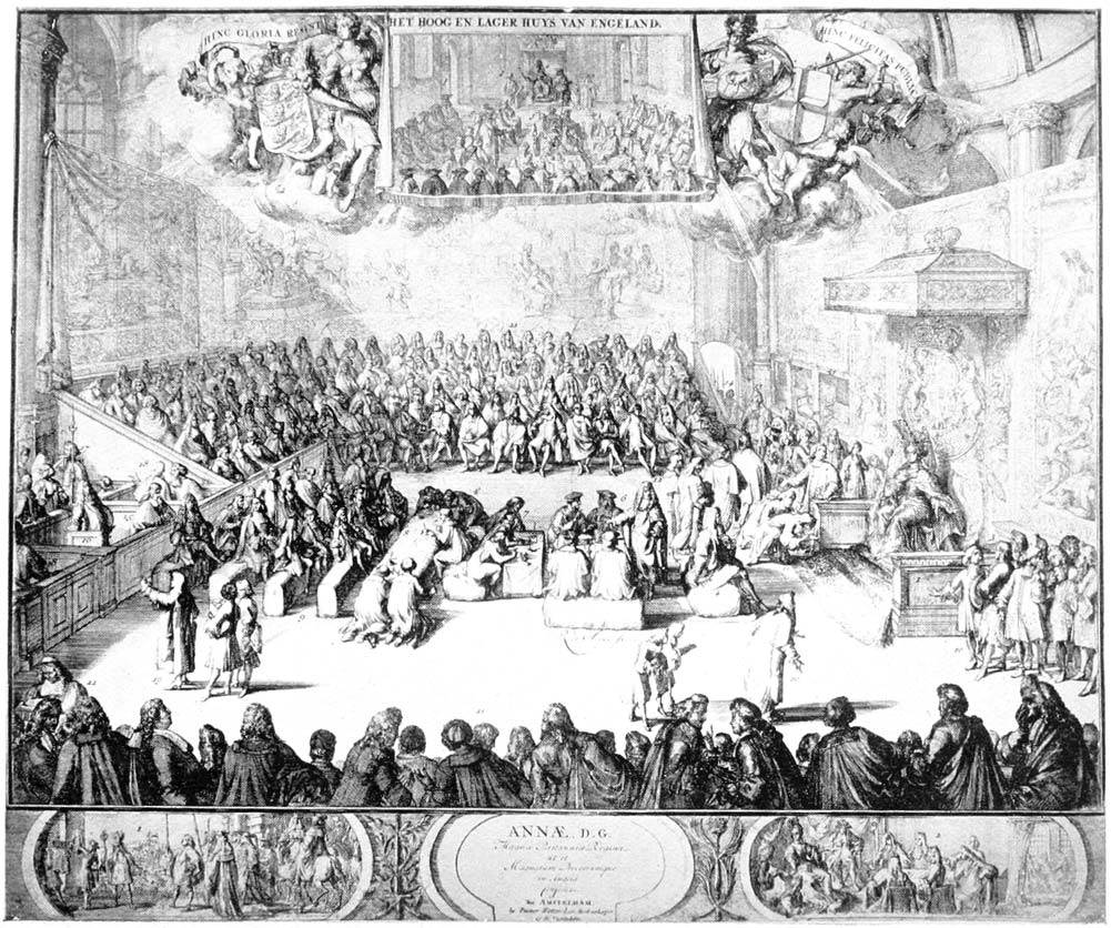 Queen Anne presiding over the House of Lords. (The plate in its first state) ▶ … Between pages 236 and 237