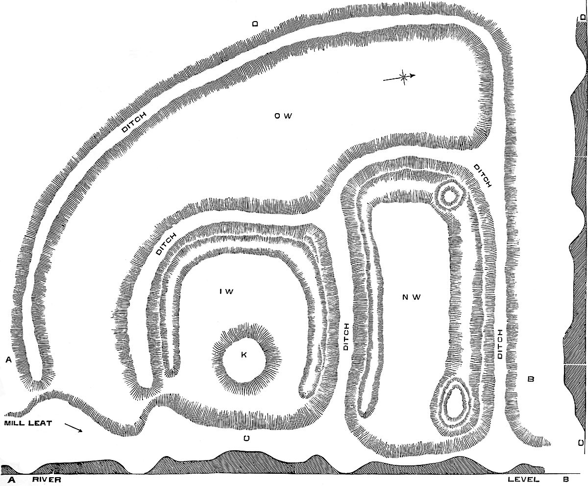The central mound, which is the main feature of these and many ninth and tenth century fortresses, is here wholly artificial, about 30 feet in height, and about 150 feet by 100 feet diameter upon its rounded and table summit. At the foot of the mound is a ditch, from 40 feet to 60 feet in breadth, and beyond this are three elevated platforms, as was not unusual. Of these, the first lies towards the north and east, and is also moated. Across it lay the principal entrance from the outer road, and to the keep. On the west side is a second platform, also moated, and in strength rivalling the keep mound itself. The third platform, far superior to these in area, and also moated, is placed beyond them, towards the north-west.