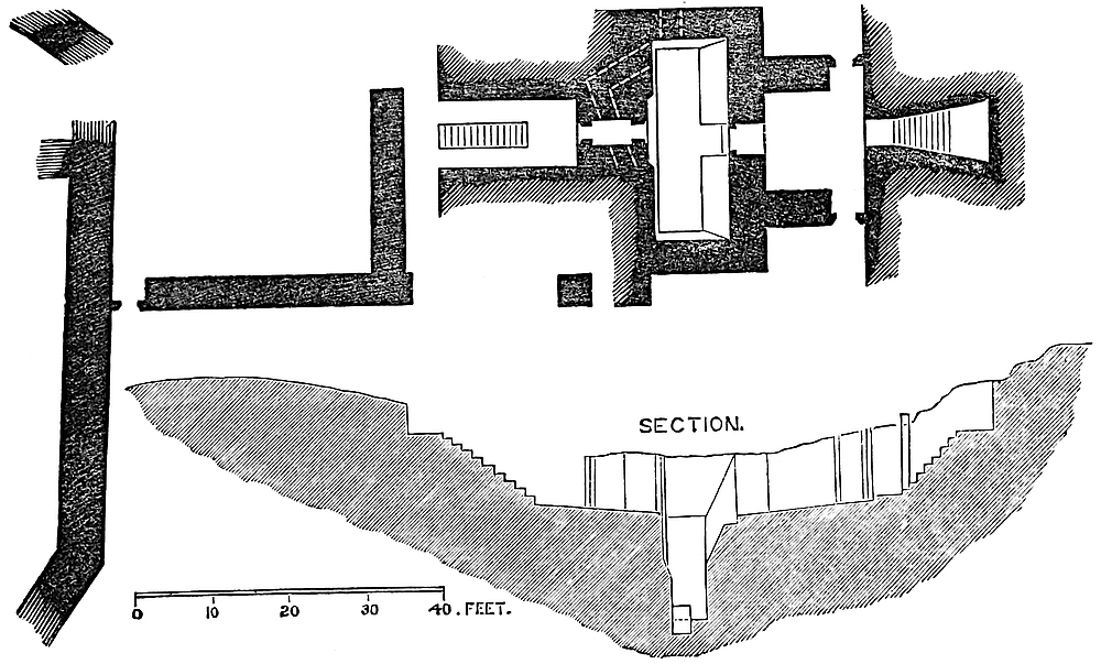 Low on the ridge, and astride upon and occupying its whole breadth, is what remains of the castle. Those who selected the spot were attracted by an immense depression, clear, sharp, and steep, as if cut by art, which here traverses the ridge, and cuts off its531 eastern portion from the higher and broader ground to the west. Upon the eastern verge of this ravine is piled up a mound of earth, in form conical and about 30 feet high, above its rocky base, though 100 feet or more above the bottom of the ravine. The mound is about 30 feet diameter at its flat top. It is probable that when this was formed the natural ravine was slightly deepened, and on the near side rendered steeper by art.