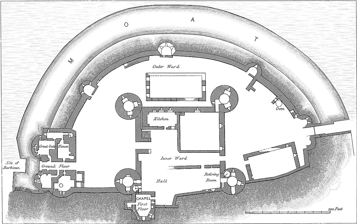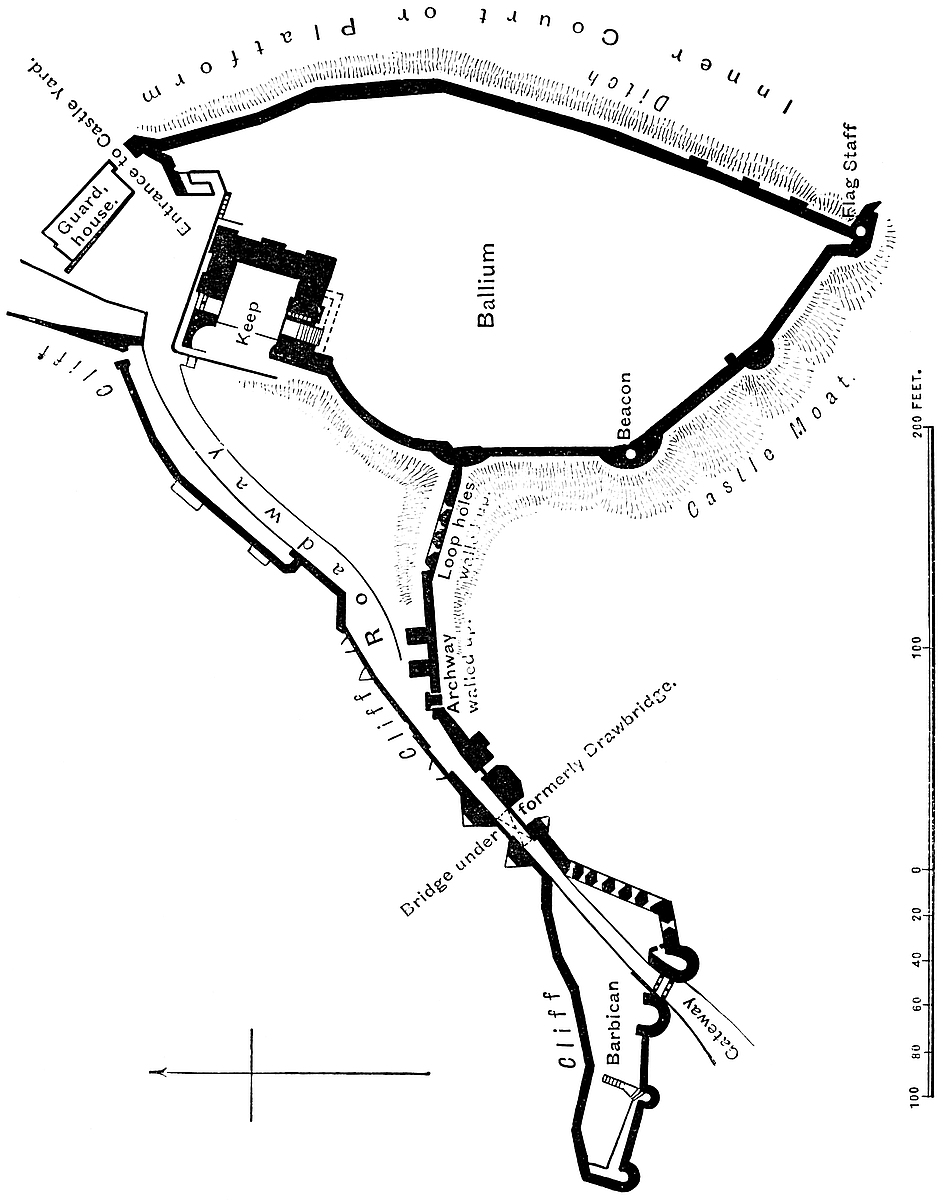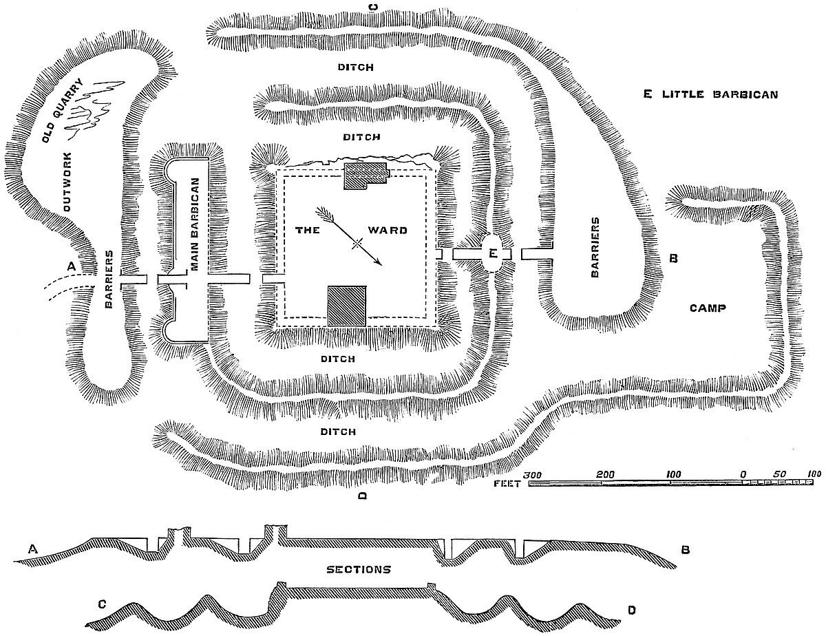 The great barbican is a very remarkable work, not unlike a similar defence at Castle Rising, which there, however, is confined to an earthwork, whereas here the defences are both in earthwork and masonry. The work is irregular in its shape, concave where it rests upon the counterscarp of the main ditch,—on its other faces convex. In depth, or from north to south, it measures about 56 yards; in breadth, 74 yards. It is defended by a ditch of moderate dimensions, which communicates with the main ditch at each end, but is scarce a quarter of its depth. The curtain wall is very irregular in outline, the west side being made up of about four straight pans of masonry, meeting at various angles. The front is a long straight wall, and the east side, also straight, meets it at a right angle. The curtain of this outwork is about 5 feet thick, and from 15 feet to 18 feet high. Upon it are four mural towers; three, drum-shaped, are 10 feet in internal diameter, with entrances at the ground floor from the court. In height they rise a story above the curtain. They are looped to the field, have timber floors, and their staircases seem to have been of timber. One tower is angular, and has evidently been the kitchen, part of the oven and the outline of the large fireplace being still visible.