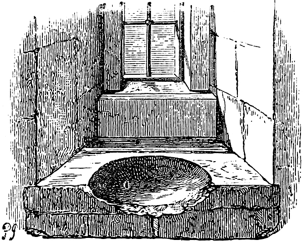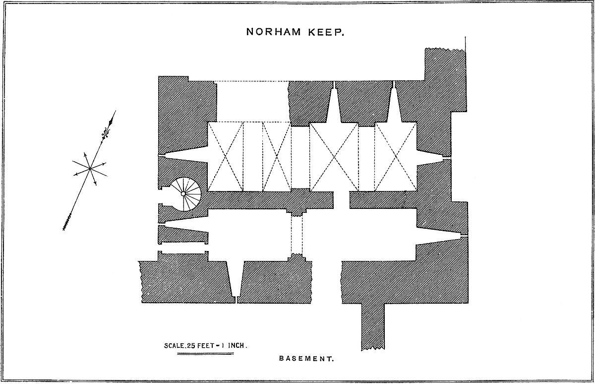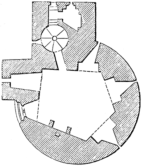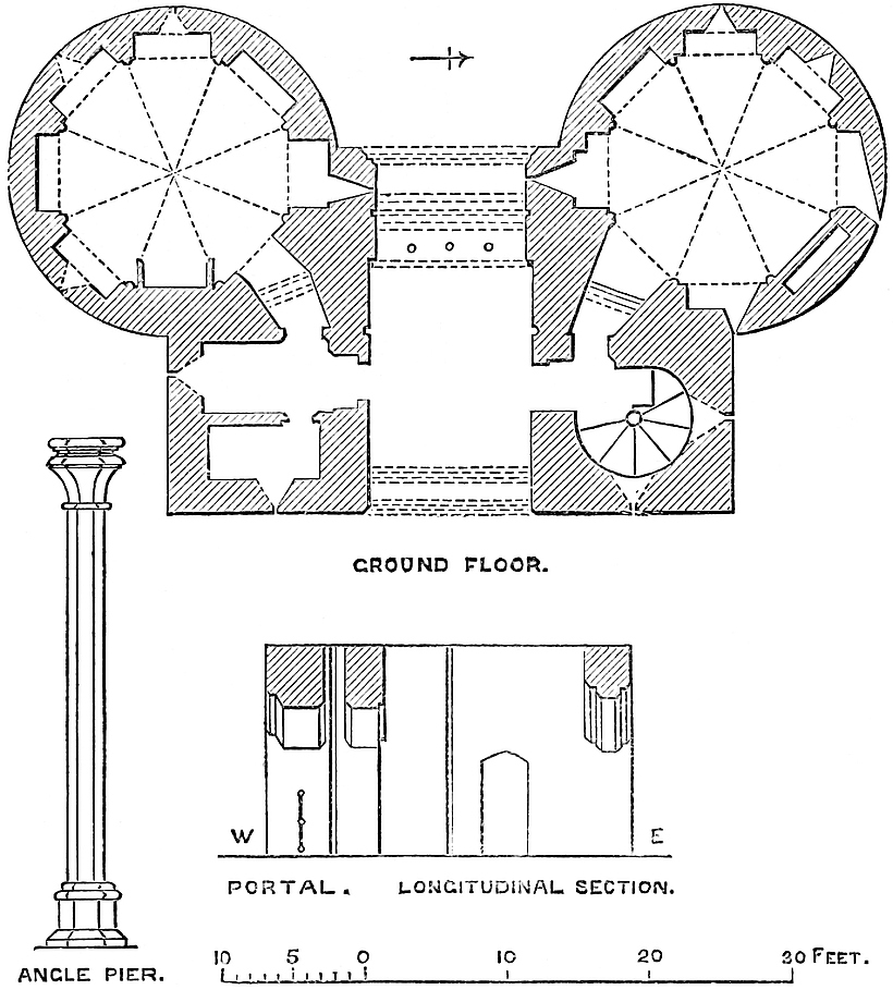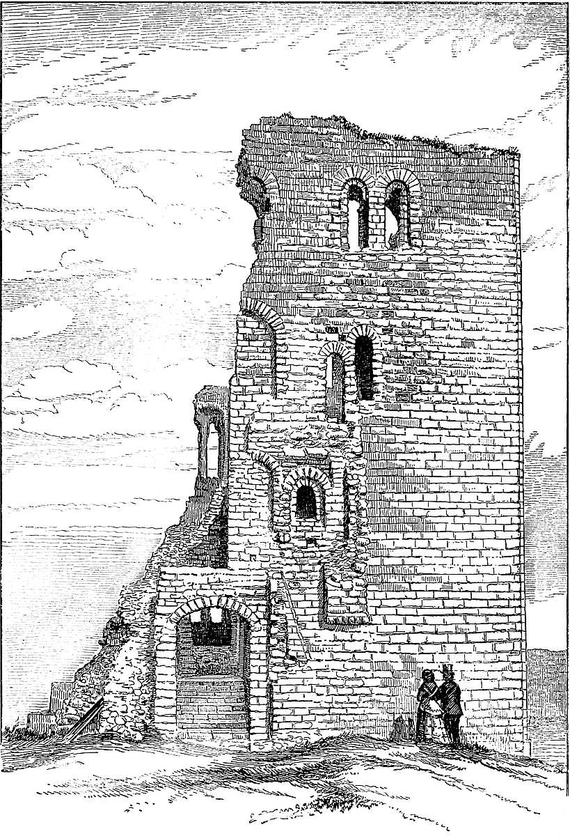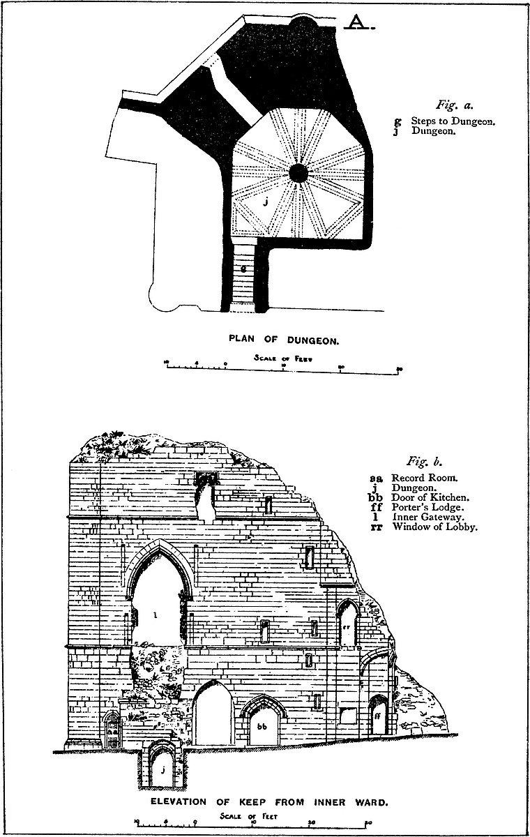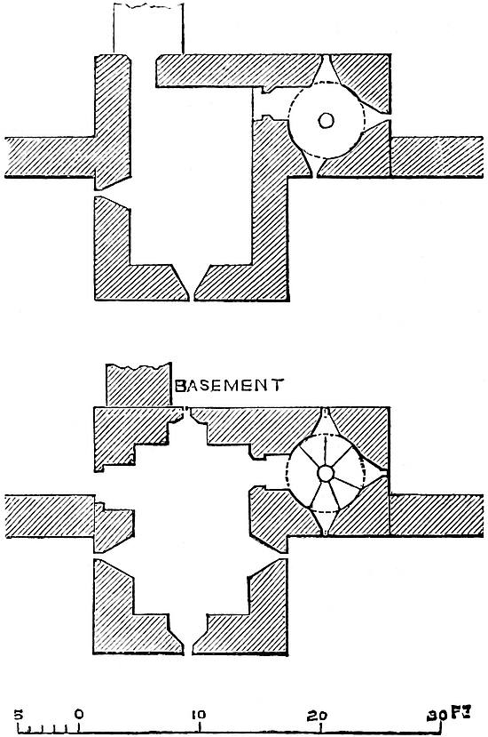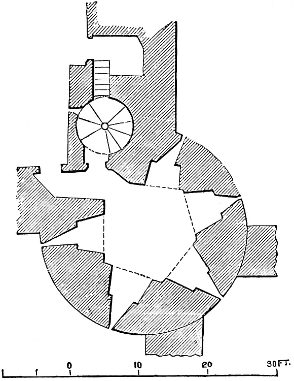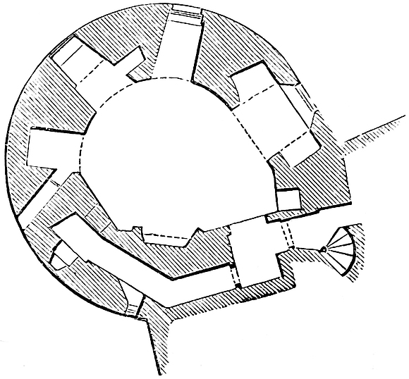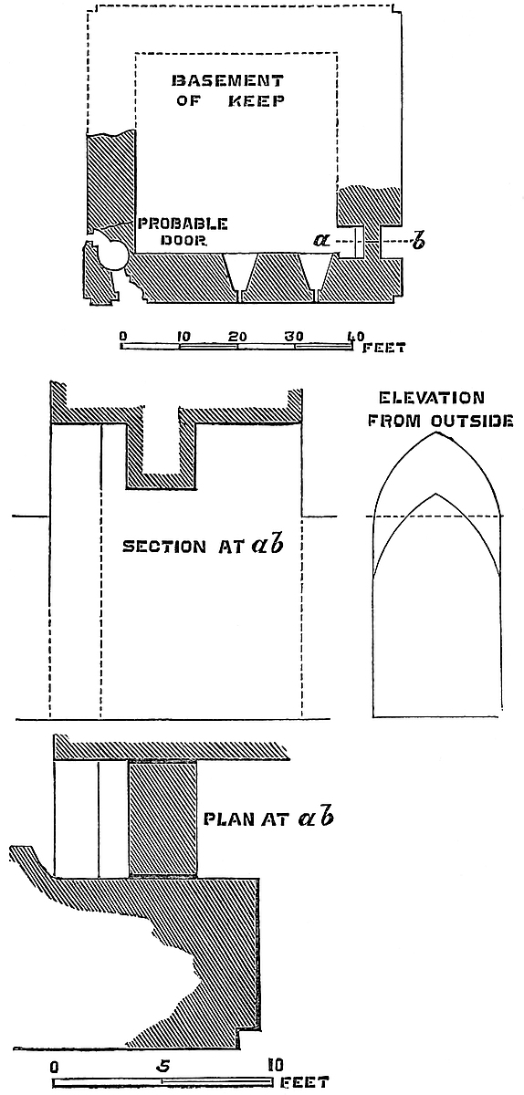 The central mound has been scarped vertically, probably in the time of Henry III., and is included within a revetment wall of great strength, and about 30 feet high. This seems to have been surmounted by a parapet, and to have been reinforced by a number of flanking towers, of which one and a part of two others remain. The most perfect is cylindrical, about 30 feet in diameter, with walls 10 feet thick. Its base is occupied by a circular pit, probably a dungeon; and, if so, a gloomy and damp one, not having a single loop or air-hole. The floor is a foot or two above the bottom level of the ditch, and the platform of timber covering it, the floor of the first story, was on a level with the top of the mound. This stage had two loops, cruciform, with the lower limb very long, and terminating in a dovetail. They are placed in large recesses, low-pointed. There was an upper floor, of which only fragments remain. The pit was probably reached by a ladder, for a door, seen in its base to the east, is an insertion. The first-floor door is represented by a breach on the south-west side. This tower flanked the inner gateway of the keep. Of the corresponding tower, to the west, a portion only remains. It was of the same size and shape, and between the two was a space of 12 feet, occupied by the gateway and drawbridge, of which the pit remains.
