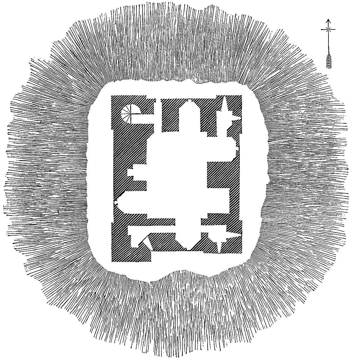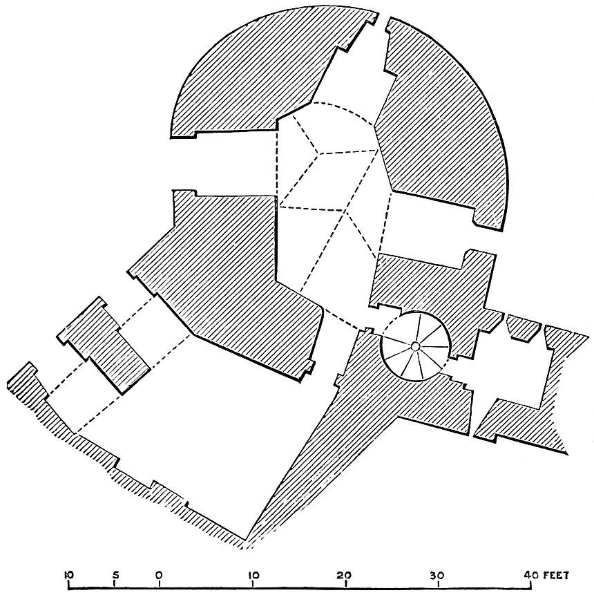 The most considerable remains of its wall are towards the south-east, and it probably had, on this side, a ditch of its own. The hall and other of the domestic buildings seem to have stood here, on the level part, judging from the very rude outline of the foundations.