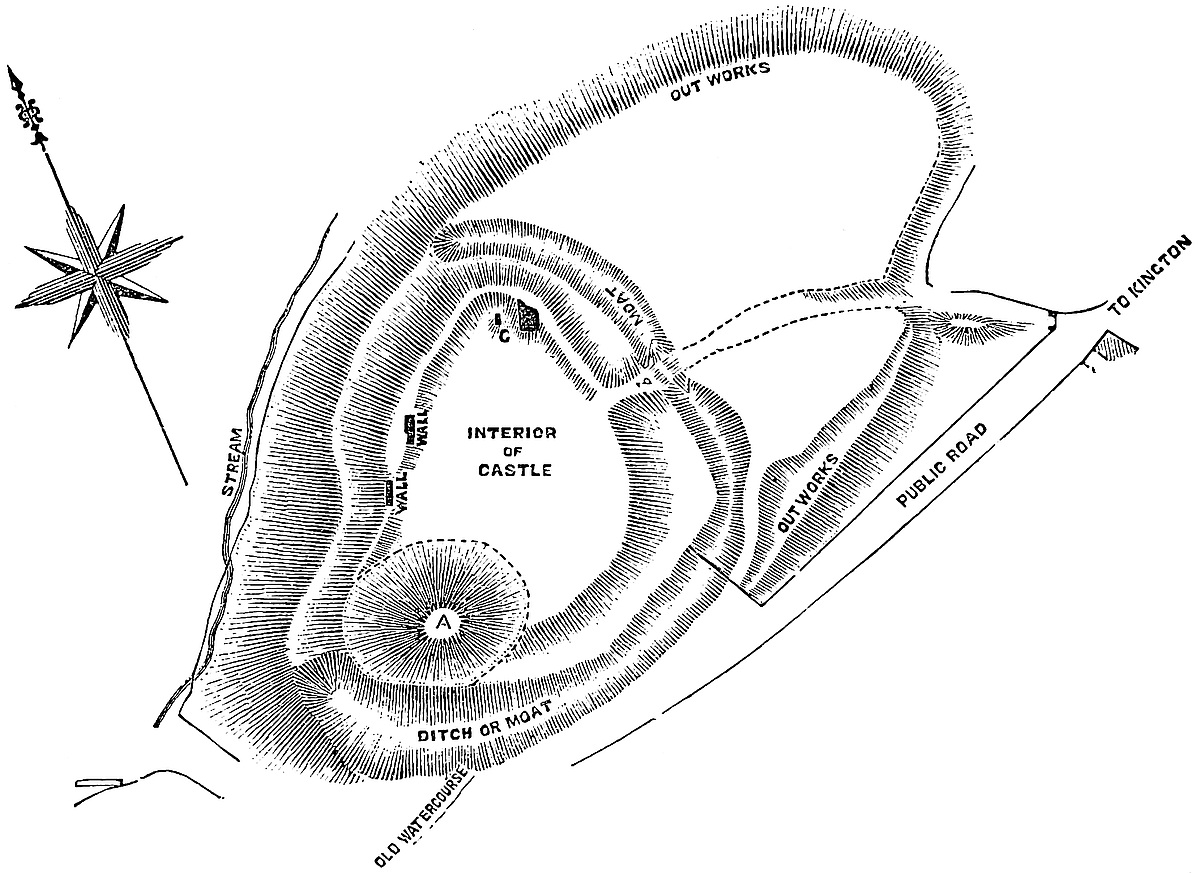 Besides these defences, along the east front of the works of the outer ward is a second ditch, carried across the ridge, here very low. Between the two ditches is a platform of no great breadth, the rear of which forms the counterscarp of the outer ward ditch, while the front is scarped into three solid half-round bastions of earth, the outline of which is followed by the counterscarp of the outer ditch. The figure of this earthwork and the freshness of the cutting show that the whole is a late addition, probably by the latter Mortimers, to cover the foot of the outer wall, and, no doubt, strongly palisaded. Again, in advance about a hundred yards on this front, and lower down the hill, a deep ditch has been cut across the ridge, and its contents thrown inwards as a high and steep bank. Again, in advance of this line of defence, the hill, for 60 yards or 70 yards, is scarred with other earthworks of an uncertain and subordinate character and purpose, but evidently old.