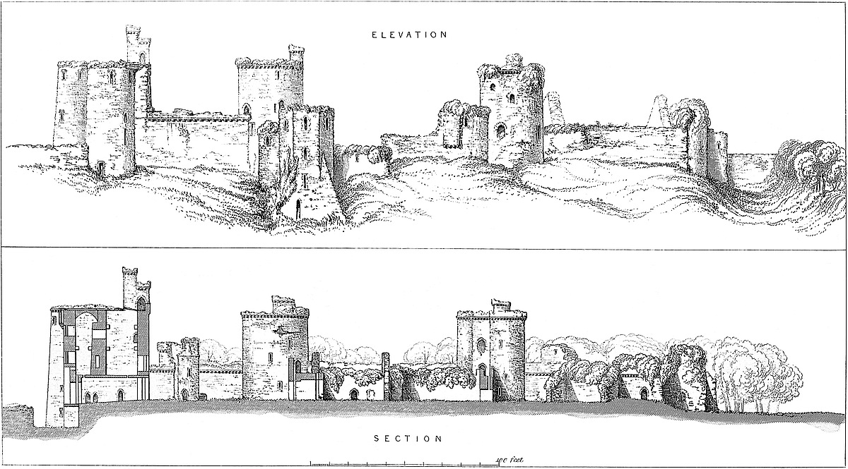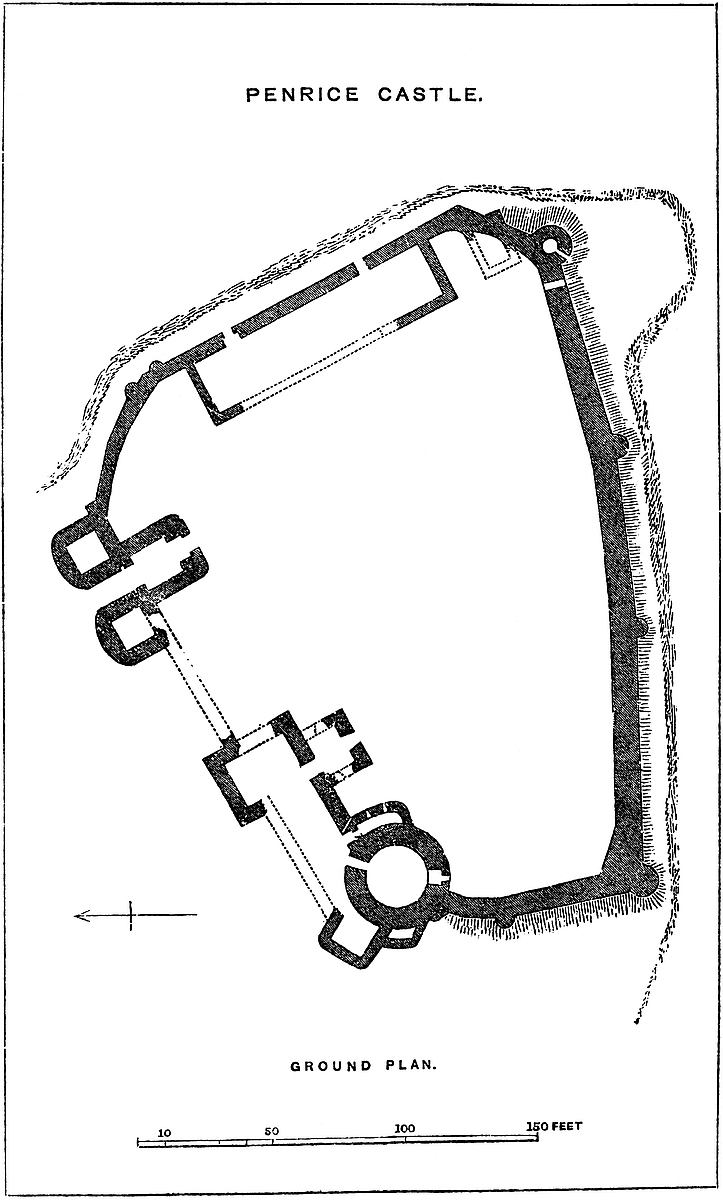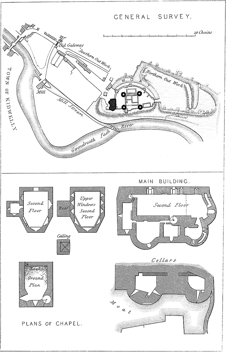 It is evident from the general design, position, and capacity of this castle, that it was not intended, like Caerphilly, for the accommodation of a great military baron, nor like Morlais or Castell Coch for a mere military port. Its central part is nothing but a fortified area, like Framlingham, at which place, however, there seems to have been, as at St. Briavels, a keep. Here certainly there was none. It is and always was a mere shell, composed of a strong and lofty curtain, mural towers, and a gatehouse. There do not appear to have been any of the usual buildings contained within a large castle. The accommodation within the walls seems to have consisted in timber-sheds, resting on stone foundations, and built against the walls. In this way a very large number of soldiers might have been accommodated.