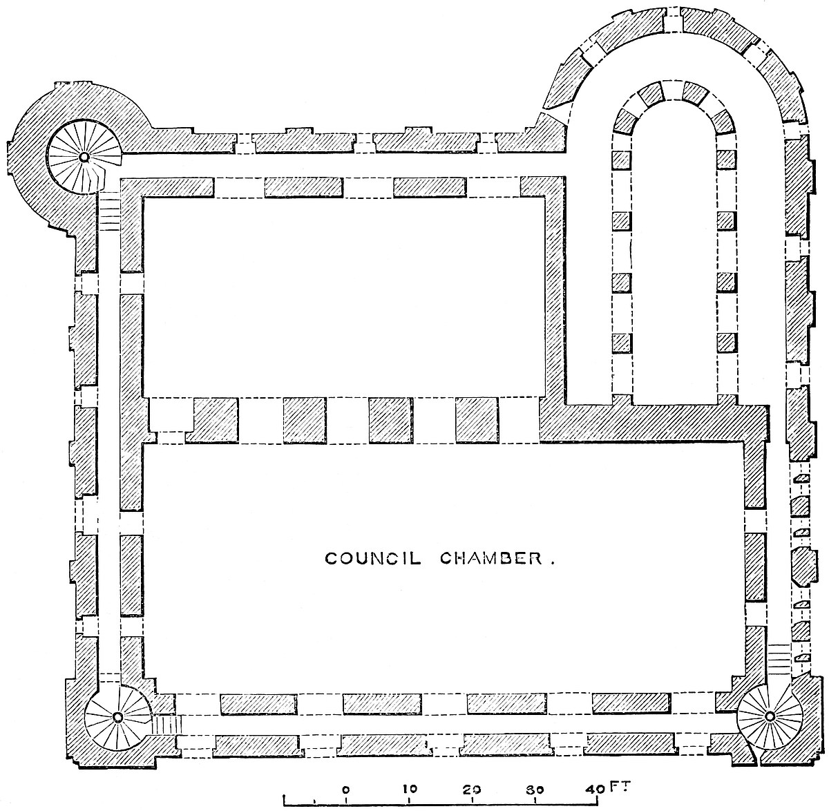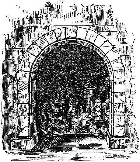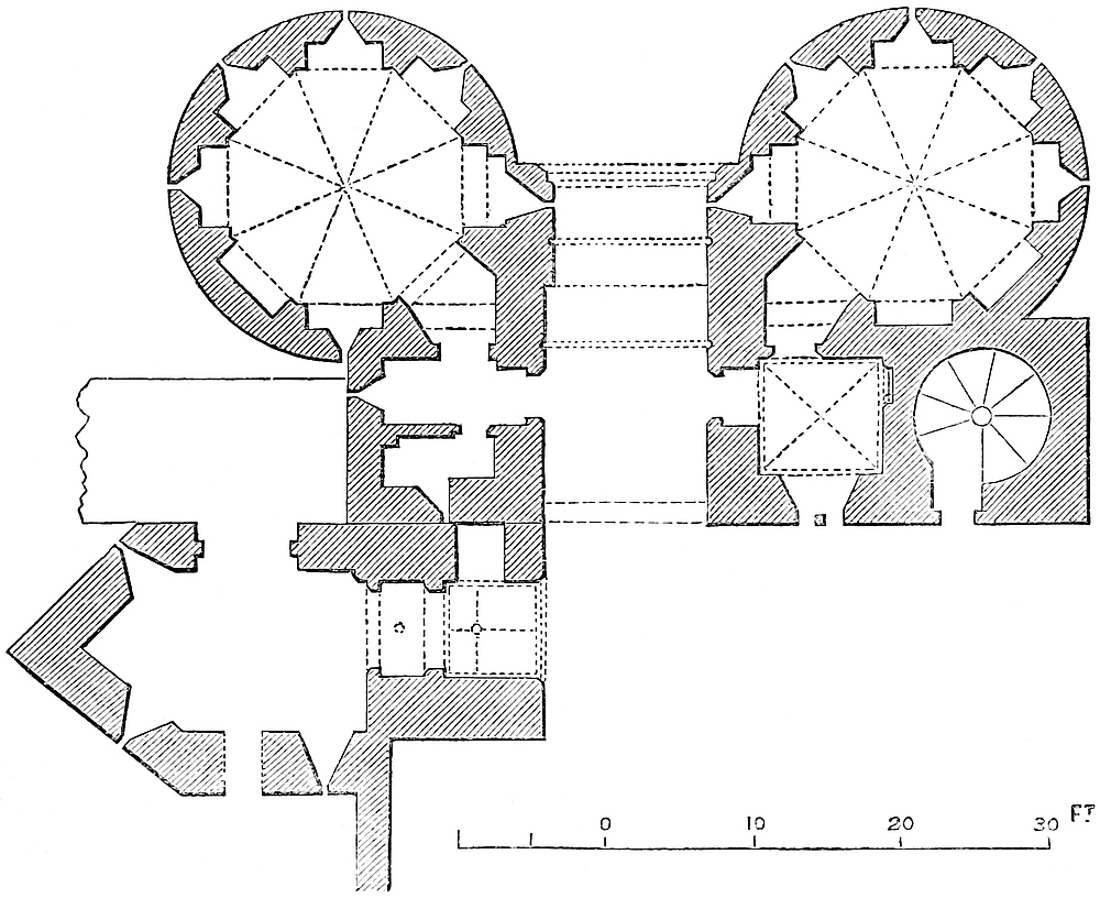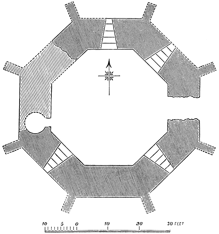 It is composed of a central ward, in general figure hexagonal, but oblong and somewhat pear-shaped, its internal diameter, north and south, being 50 yards, and its greatest cross diameter, east and west, 37 yards. The northern end measures, also internally, 15 yards, the southern 18 yards. The sides next to the north end are, in length, 27 yards, those next the south end 23 yards and 26 yards. The wall is 10 feet thick at the base, and slopes externally to 7 feet at a height of 15 feet. In height it is about 30 feet to the rampart walk or allure. The towers at the two southern angles are 18 feet internal diameter, with walls 7 feet thick. The two middle towers are 12 feet, the other two at the northern angles form the great gatehouse, and are 13 feet. They are about 45 feet high. The four southern towers have a basement floor a little below the court level, with one loop; a first floor with three loops, and a second floor, whence was a way to the ramparts of the curtain. There seems, also, to have been an upper or third story. The floors were all of timber, and there are no staircases or mural chambers. The gorge walls of the two southern towers are broken away, that of the western partially so; that of the eastern is perfect, and contains the entrance doorway of 3 feet opening. The gatehouse towers are also entered at the gorge from the court, but the gorge wall is thicker, and contains a series of mural staircases ascending to the summit. These are not “turnpike,” and are not continuous, but begin anew at each floor. The gateway, concealed, save from the front, by the unusually bold projection of the flanking towers, has a passage 10 feet wide and 8 feet deep. The barrel-vault remains, but the ashlar of the internal gate is gone, and its former existence is only shown by a bar-hole. Of the outer gateway two bar-holes remain, and a fragment of the portcullis groove, which is 4 inches square, and placed outside the gate, so that the grate was wholly visible even when raised, unless, indeed, concealed by a timber brattice. It was worked from a machicolation between the towers, now gone. The flanking towers are without loops, that to the left on entering is approached from the vault by a narrow doorway. If there was a drawbridge attached to this gate, its heel must have rested upon a large stone about 10 feet in advance and 6 feet below the level of the portal. The ditch at this point is nearly 100 feet broad, and 30 feet to 40 feet deep. It is evident that there were no bridge-piers of masonry in the ditch, so that the roadway probably rested on trestles.