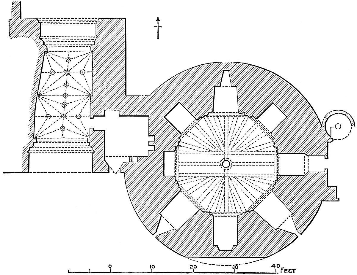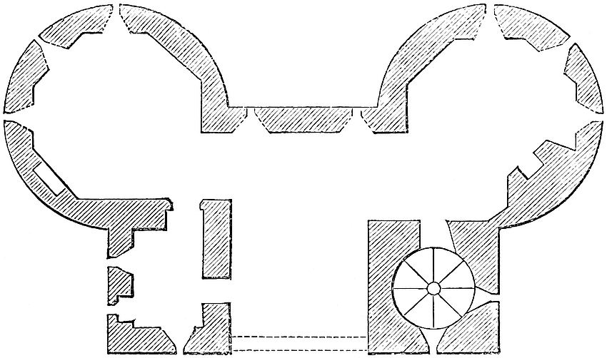 The Castle of York, to which the Conqueror directed his special548 attention, ought, one would suppose, to retain some memorials of that age. This, however, is not the case. The wall in the lower ward, upon the Foss, may, in parts, be early in the twelfth century, but the round mural towers cannot be earlier than the reign of Henry III. Clifford’s Tower, indeed, the keep of the fortress, is a very interesting structure. Circular or polygonal keeps, such as Cardiff, or Arundel, or Pickering, were often of the Norman period; but the regular round or quatrefoiled tower, introduced largely by Philip Augustus into France, found its way into England, and the two principal varieties of castle keep of the quatrefoil pattern were at Warwick, now removed, and this at York. It is in plan a quatrefoil of 60 feet and 80 feet diameter, with walls 9 feet thick and 40 feet high, three of the angles above the first floor being occupied by circular turrets corbelled out, and the fourth by a small square projection, which contains, below, the entrance, and above, a small chapel, handsomely arcaded and embellished with the dog-tooth moulding. This keep had a ground floor looped all round, and a first floor with corresponding loops. Probably the chambers were attached to the walls, and supported upon posts and beams, leaving a small open court next the entrance and containing the wall. Two circular staircases lead to the first floor, and from thence to the battlements. The tower has been much injured by attempts, first to destroy and then to repair it. The tower itself looks of the reign of Richard or John. The chapel has been regarded as an addition, if so, it is a very early one. York Castle was notorious in the reign of Richard I., for the dreadful tragedy perpetrated there upon and by the Jews in 1189. The castle was then burned, and we are told that Osbert de Longchamp, governor for the king, and who took up the cause of the Jews, rebuilt the work of Rufus in the castle. Probably this included the keep, very nearly as it is now seen. There was a second and very narrow ward outside the present castle wall, capped with low drum towers, apparently of the reign of Henry III. or Edward I.