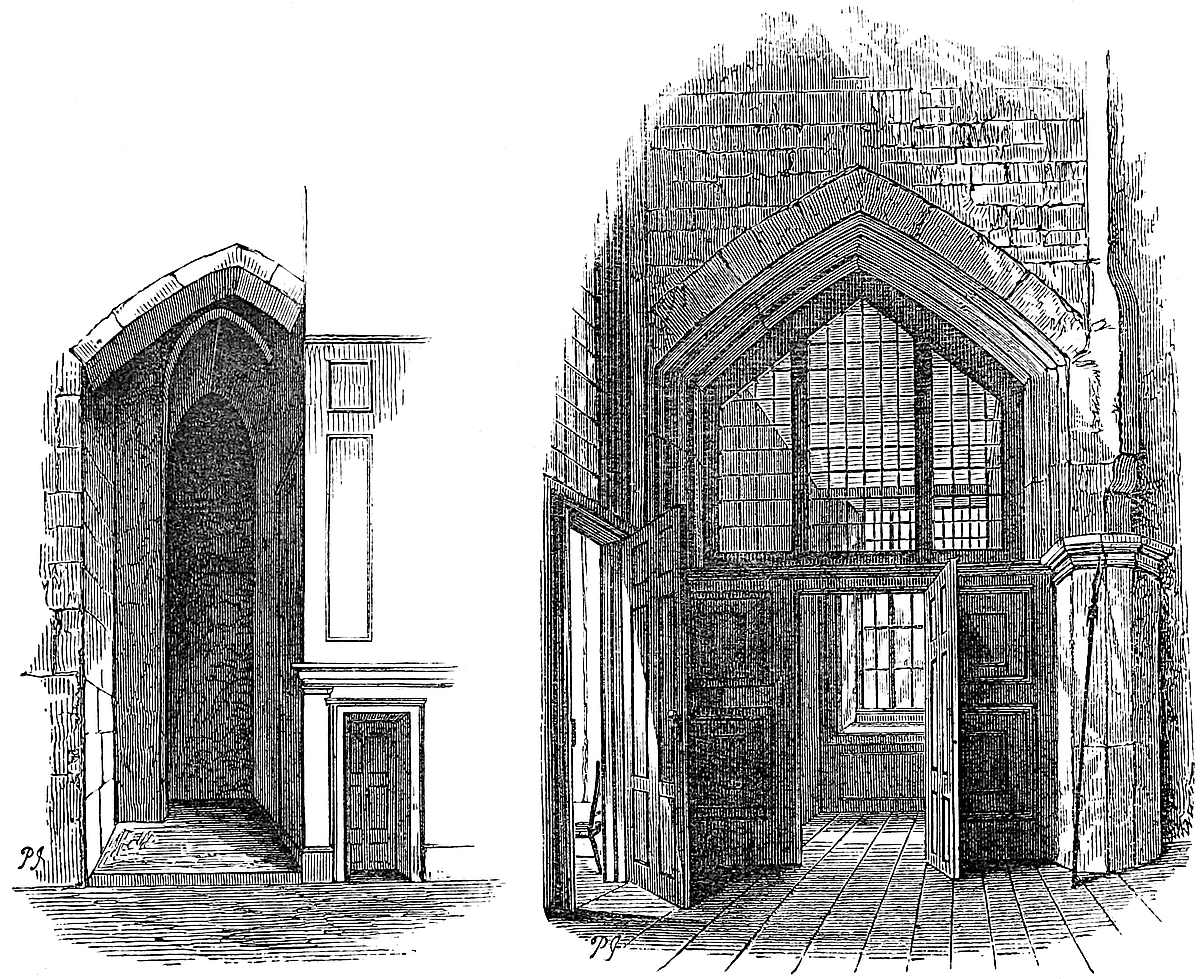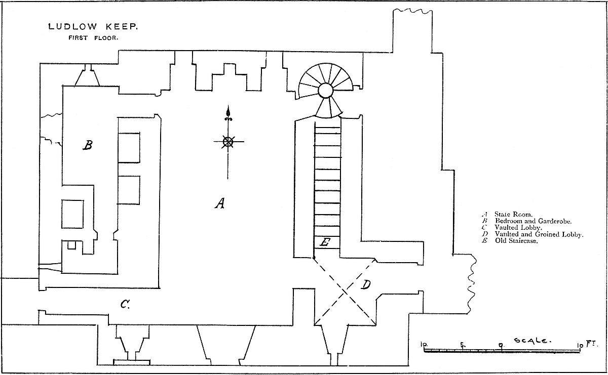 Roger, eighth lord, styled Lord Mortimer of Wigmore, created Earl of March in 1328; served both in Ireland and Scotland. He was governor of Builth Castle, took Cardiff from Hugh le Despenser, and had a grant of Clun. He joined the party of Thomas of Lancaster against Edward II., had a narrow escape for his life while in prison, and in gratitude built St. Peter’s Chapel in the outer ward of Ludlow Castle. In 1322, after the battle of Boroughbridge, he fled to France, and the king seized on Wigmore, causing an inventory to be drawn up of its contents by John de Cherleton, the keeper. There were springholds, the artillery of the age, cross-bows, English and Oriental armour and weapons, a chess-board and a board for talles and draughts, five peacocks in the courtyard, and grain and cattle in quantity. On the earl’s return, followed his intimacy with the “she-wolf of France,” his acquisition of a prodigious number of manors in England, Wales, and Ireland; his seizure at Nottingham Castle, his attainder, and his execution by hanging in 1330. It seems probable that this lord rebuilt the castle, superseding the Norman work by that, in the Decorated style, which still remains.