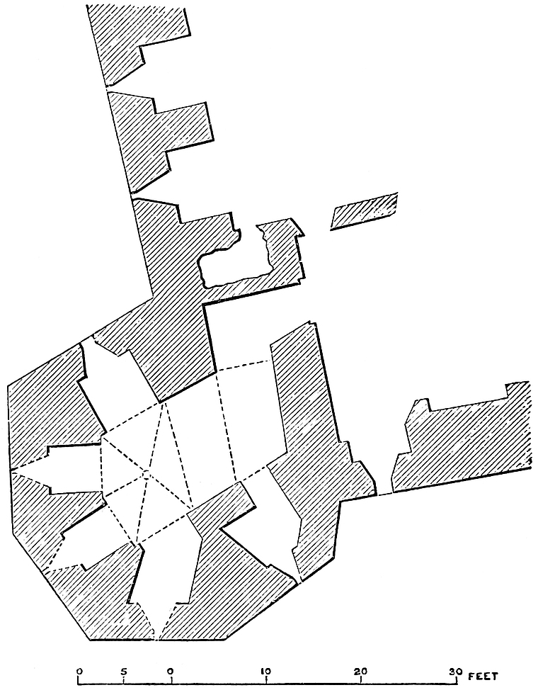 The lesser barbican covers the south entrance, the way to which does not, however, appear to have lain across it. It is of earth only,—that is, has no walls, but is of great strength; in shape, and, indeed, in function, it is a lunette. Its diameter, in the direction from the gate outwards, is 20 yards, and its breadth 100 yards. It520 rests upon the counterscarp of the main ditch, here about 20 yards broad. It has, also, on its front and sides, a ditch of its own about 20 yards broad, and communicating with the main ditch. In parts this work seems to have been revetted. It was connected with the main work or body of the castle by a narrow bridge, which sprang from its eastern angle, and of which traces remain. There does not appear to have been any outer gatehouse at this end; probably the approach was by a boat across the ditch, or by a plank bridge upon trestles.