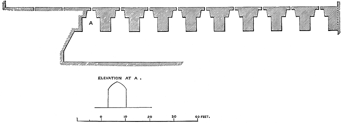 The outer gatehouse is placed at the south-eastern corner of the barbican, terminating its wall and resting upon the counterscarp of the main ditch. It is of rude construction, composed of two solid masses or cheeks of wall, 46 feet long and 9 feet thick, rounded at the outer end. Most of the northern wall is gone, and with it the roof or vault of the entrance passage, and the details of the gateway. This sort of entrance between the high and long walls is found at Conisborough and Berkhampstead. The other or inner end of the barbican wall, at the south-west corner, ends abruptly, and probably descended a little way down the counterscarp of the main ditch, so as to prevent an entrance. In the wall is a recess 6 feet 4 inches broad and 3 feet deep, which may have been a public garderobe, similar to that in the wall of the middle ward of Corfe Castle.