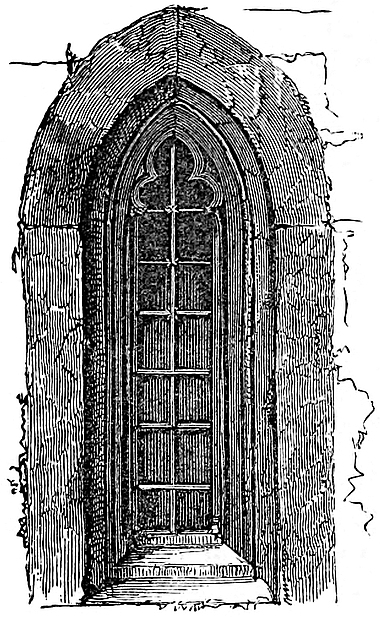 A fragment of the base of a similar tower is seen at the south-west angle of the mound, and there were two, or perhaps three more, to the south-east and north-east; but this part of the work is concealed by loose earth and thick vegetation. Altogether, it appears that the keep was a mound, scarped or faced by a strong revetment wall, in a polygonal form, and capping each angle was a lofty round tower, rising out of the ditch. There is said to be a well in the south-west corner, but it is not now visible. From the inner gatehouse a bridge crossed the inner ditch, and landed upon the opposite bank, a few yards in the rear, or west of the outer gatehouse. This was a rectangular structure, having at its eastern or outer end two three-quarter drum towers, corresponding in size and workmanship with those flanking the inner, as do these the outer gateway. They are looped with cruciform and dove-tailed loops, and between them is a depressed pointed arch of plain pattern, chamfered, and with an exterior roll moulding. There is said to be an escutcheon in the wall above the gateway; but if so, it is concealed by ivy. Above is a corbel table, pierced with machicolations. The half of this gatehouse, south of the entrance passage, is tolerably perfect. It contains a chamber in the south wall, in which is a window of three lights, acutely pointed, under an acutely pointed head. The heads of the lights are cinquefoiled, and the apertures in the head quatrefoiled, the whole being late Decorated. This window is said to have been removed from the old parish church when “restored.” The northern half of the gatehouse is nearly all destroyed. There remains part of a curtain wall, passing southwards from the gatehouse524 to the edge of the ditch. A similar wall on the north side passes backwards along the edge of the ditch, and upon it are the remains of two round towers, connected with the gatehouse. What masonry remains is composed of large square blocks of red sandstone. The whole of the older part seems of the reign of Henry III., and is, no doubt, Fitz-Warine work. There is little or no trace of masonry on the several platforms or banks, save that on one bank to the south-west is a mark of a revetment wall which may or may not be old. Probably the masonry was confined to the keep and barbican-like platform occupied by the outer gatehouse, which would include an area for a very sufficient garrison. The banks, like those at Berkhampstead, are narrow, and would scarcely have carried a wall. The ditches were all filled from the brook, with which they communicated at each end.