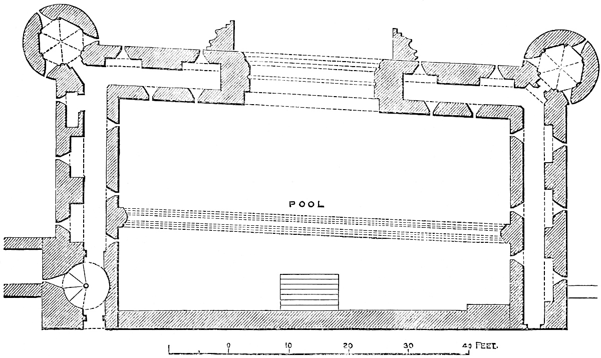 The area of the court is quite clear of buildings, but a few heaps519 of rubbish show that it contained barrack buildings of timber, with stone basements, placed against the walls, which have been plastered. There is no trace of hall, chapel, kitchen, well, or permanent lodgings, and no ornament of any kind; no moulding, no mural chambers or garderobes, no staircase save in the great gatehouse, and only two small fireplaces, in the first and second floors of the north-eastern gate tower. The towers are not only bold and lofty, and about 60 feet high, but the outer half of their bases is carried many feet down the slope of the ditch, giving them great breadth of base, and a very substantial and massive character.