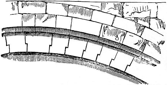The fortress, or military part of the Roman city, was confined to the left bank of the river. The suburbs crossed the Ouse, and were widely extended to the south-west and north. The walled enclosure measured 469 yards north-west and south-east, or up and down the stream, and 550 yards in the direction at right angles. There were four principal gates; those to the north-east and south-west in the centre of their respective sides, those to the north-west and south-east somewhat to the south of, or nearer to, the river than the centre. But it is to be remarked that as the former gates, being in the centre, were 234 yards from each angle, so the latter was also 234 yards from the angles to the south. This looks as though the original walled area had been a square of 468 yards, and that afterwards, when the buildings became of a permanent character, and the lines of the great roads leading up to the gates were fixed by habitations along them, it was found necessary to enlarge the area, and that this538 was done by adding a breadth of 82 yards on the northern side, which would of course throw the north-west and south-east entrances by that much out of centre. If, moreover, we suppose the whole area wall to have been rebuilt when this supposed alteration was made, we shall have an explanation of the modern character of the extant masonry, which is held by those conversant with Roman work to be of a late period. If this be so, it is exceedingly probable that the whole enceinte was then rebuilt, for so important a city would scarcely have been left unwalled during the earlier centuries of its prosperity. Considering the magnitude, population, and wealth of Roman York, and the number of public buildings which must necessarily have accumulated during the four hundred years which elapsed from the conquest by Claudian to the end of the Roman rule, and the presence of some of which is attested by inscriptions and foundations, it is remarked how very few monuments of the period remain above ground, or rather how completely the whole, with one or two exceptions, have disappeared. No doubt, under the 15 feet or 16 feet of débris which are supposed to cover up the Roman city, and the equal depth of later soil which seems to have accumulated since the commencement of the Saxon or English period, must rest covered up many curious remains of the Roman, as well as of the later periods. Some of these are, from time to time, laid bare in the formation of sewers, but the unburied remains of Roman work seem to be confined to one tower and the adjacent wall, and fragments of the wall in another part of the city. The Multangular Tower, forming one corner of the Roman area, is a shell of masonry, 42 feet in exterior diameter, and 20 feet at the gorge, which is open. It is not placed, as in Norman works, so as merely to cap the junction of two walls which would have met at a right angle, but the whole angle is superseded, as in Roman works, by a curve of 50 feet radius, and the tower stands in the centre of this rounding, three-quarters of it, presenting nine facets, being disengaged. The tower and the contiguous walls are 5 feet thick. The Roman part of the work is about 15 feet high. It is of rubble, faced with ashlar, the blocks being about 4 inches by 5 inches or 6 inches, very seldom more. There is one band of five courses of brick that may be traced along the adjacent wall, though the whole has been much injured and patched. Upon the Roman work has been placed an ashlar upper story about 3 feet thick and 12 feet high, pierced by nine cruciform loops, one in each face, and set in a pointed recess, an addition of early English or early Decorated date. The wall, extending south-east from the tower for 53 yards, is of the same date, style, and material. Both formed a part of the defences of the mediæval city. The opposite wall, running eastward, has been partially destroyed, and is now only 4 feet high, and at a short distance becomes buried in the east bank. This part of the wall was evidently destroyed before the earthwork was thrown up, for not only is it buried within the bank, but the later wall of the city is built 4 feet in front of it. It is to be observed that the Roman539 tower and wall, where perfect, are entirely unconnected with any bank of earth, and the ashlar facing, both inside and out, shows this always to have been the case. The wall stands on the natural surface of the ground, and is seen of equal height inside and outside. This feature in the Roman defences is not peculiar to York, but is seen at Porchester, Silchester, and elsewhere. It is evident that the earthworks, which form so important a feature in the defences of York, are all of post-Roman date. Another fragment of the Roman wall is seen in a private [Mr. Gray’s] garden, where it has been covered up by about 12 feet of débris, and has recently been laid open at a point not far from the old northern gate. Here, also, the wall underlies the earth-bank on which the latest wall is built. A third fragment of this Roman wall is exposed in a court close east of Monk Bar. It is about 6 feet high, and is ashlar faced, and until lately was covered up in the earth-bank. Probably there is still much of this wall still covered up, as it is thought that the level of the Roman city is here at least 20 feet lower down. Although so little of the Roman wall is seen above ground, it has been traced at various points, so that it may be considered as established that it included the whole area; that there were four angle towers, and four main gates, of which Bootham Bar represents one, though no trace of Roman work appears in the mediæval structure, which, indeed, probably stands at a much higher level than its Roman predecessor. The line of road from this bar is Roman, and led to Isurium or Aldborough. Of the other three gates, the position has been ascertained by excavation. That between Monk Bar and Mr. Gray’s garden was on the road leading to D