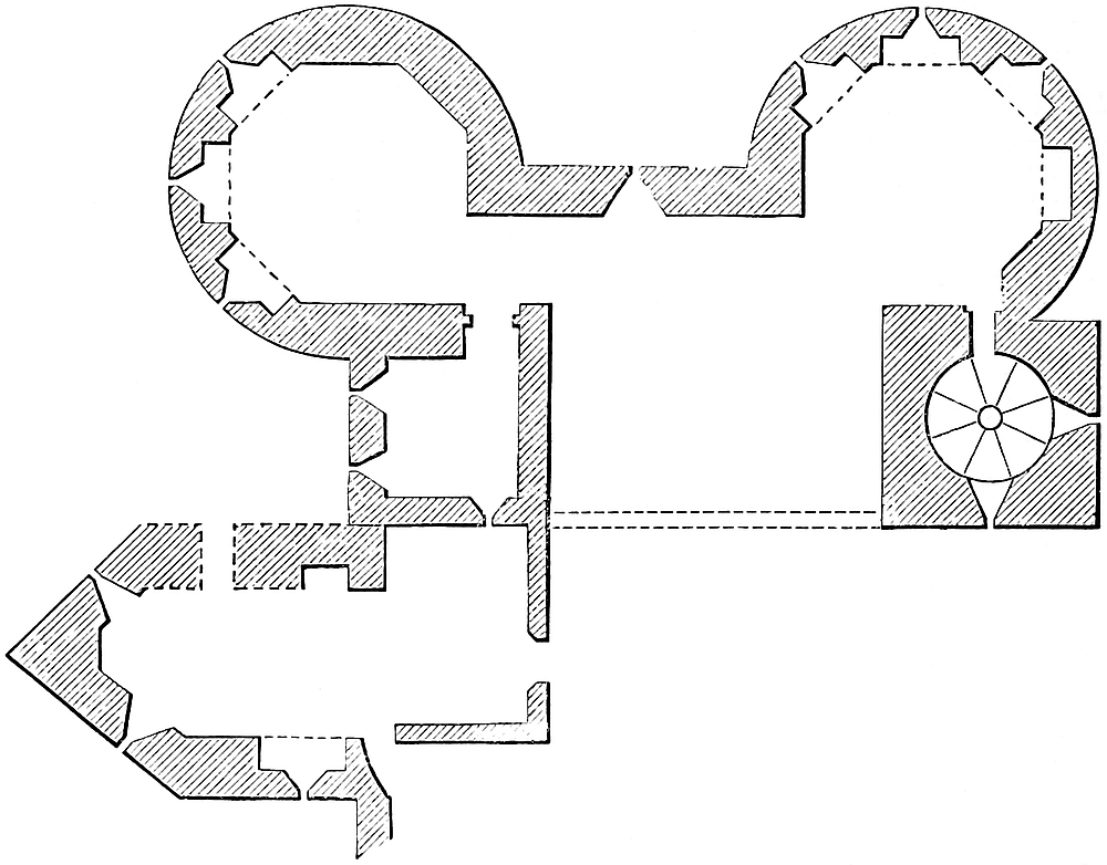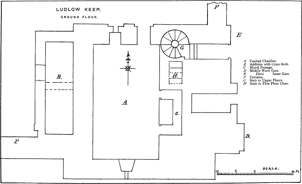 The tower, of which a tall fragment remains on the south-western side of the inner ward, marks the point of junction between the wall of that ward, the keep, and the wall of the outer ward. This latter wall, descending the steep natural slope, protects the inner ward gate from the west, and shows what appears to have been a postern, and beyond it a rectangular mural tower of bold projection, and marked outside by a bold cordon above its base. This is evidently an original Norman tower. Beyond it, being the southern wall of the ward, the Norman work is distinctly seen. The wall was in process of being rebuilt, and its imperfect junction with the new work is apparent. Of this later date is a curious large rectangular building, on the wall, of bold projection, and divided by a cross-wall into an eastern and a western chamber. It was of two floors, and below them a basement which has been vaulted over and fitted with exterior steps and doorways in the Perpendicular period. The building itself is early and excellent Decorated, as shown especially by the form and detail of a pair of two-light windows. From this tower the curtain, of the same date, extends to the great gatehouse which is to the south-east. This is much broken. It is rectangular, with a portal-vault below and two chambers above; one for the working of the outer, and one for that of the inner portcullis. The rib of the central portal remains, with a drop-arch and a square portcullis groove. In the inner chamber is seen part of a large fireplace with a good Decorated hood. Only one portal-arch remains, but from its position it is pretty clear that there were three. The archway is much choked with rubbish. From the great gatehouse the curtain curves sharply towards the north, enclosing the east face of the ward. Upon it is a bold half-round tower, of which the lower part, well seen from the ditch, and probably solid, is very perfect. It rises only to the533 level of the ward. Thence the curtain turns the north-east corner of the ward to the remains of a polygonal tower, or more probably a square tower with the angles boldly chamfered; and from this it ascended the slope so as to join the inner ward at its north-east angle, where the traces have been mentioned of a large and probably round tower; and thus is completed the circuit of the outer ward.