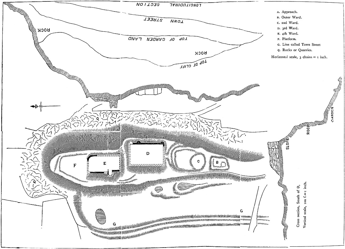 The middle ward is less easily traced. It seems to have been concentric with the outer ward; like it, appended to the south-east face of the inner ward, but of much smaller area, and much of that area occupied by the steep hill-side.