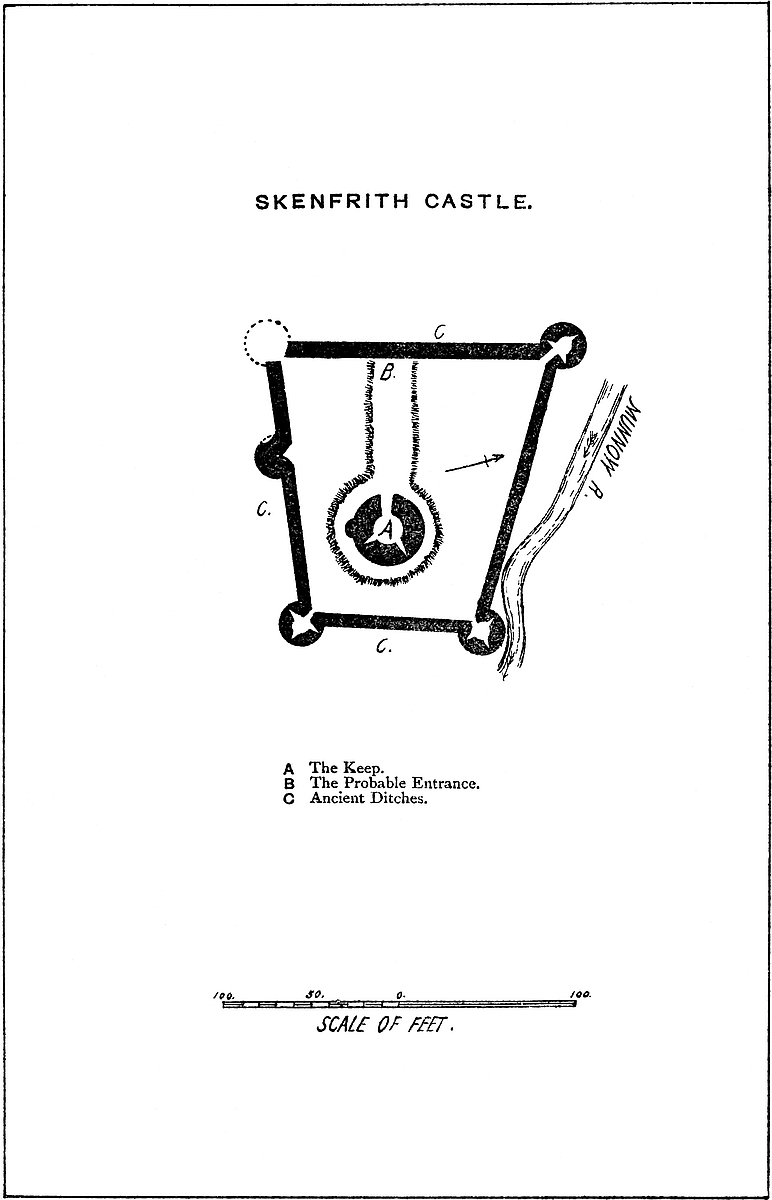 Moreover, the capacity for lodging a large body of troops was not confined to the inner ward. The outworks are also spacious and strong, and could contain a small army, or the élite, or perhaps the cavalry, of a large one, besides affording accommodation for a considerable herd and flock of cattle and sheep. Such a place would be secure against any ordinary inroad of the Welsh, and supported, as it would be, by the equally strong, though less capacious, castles of Grosmount and Skenfrith, not to mention Chepstow and Caerleon, which were not always in friendly hands, not only would the entrance of a Welsh army into Gwent be difficult, but its retreat, once within the line, would be almost impossible.