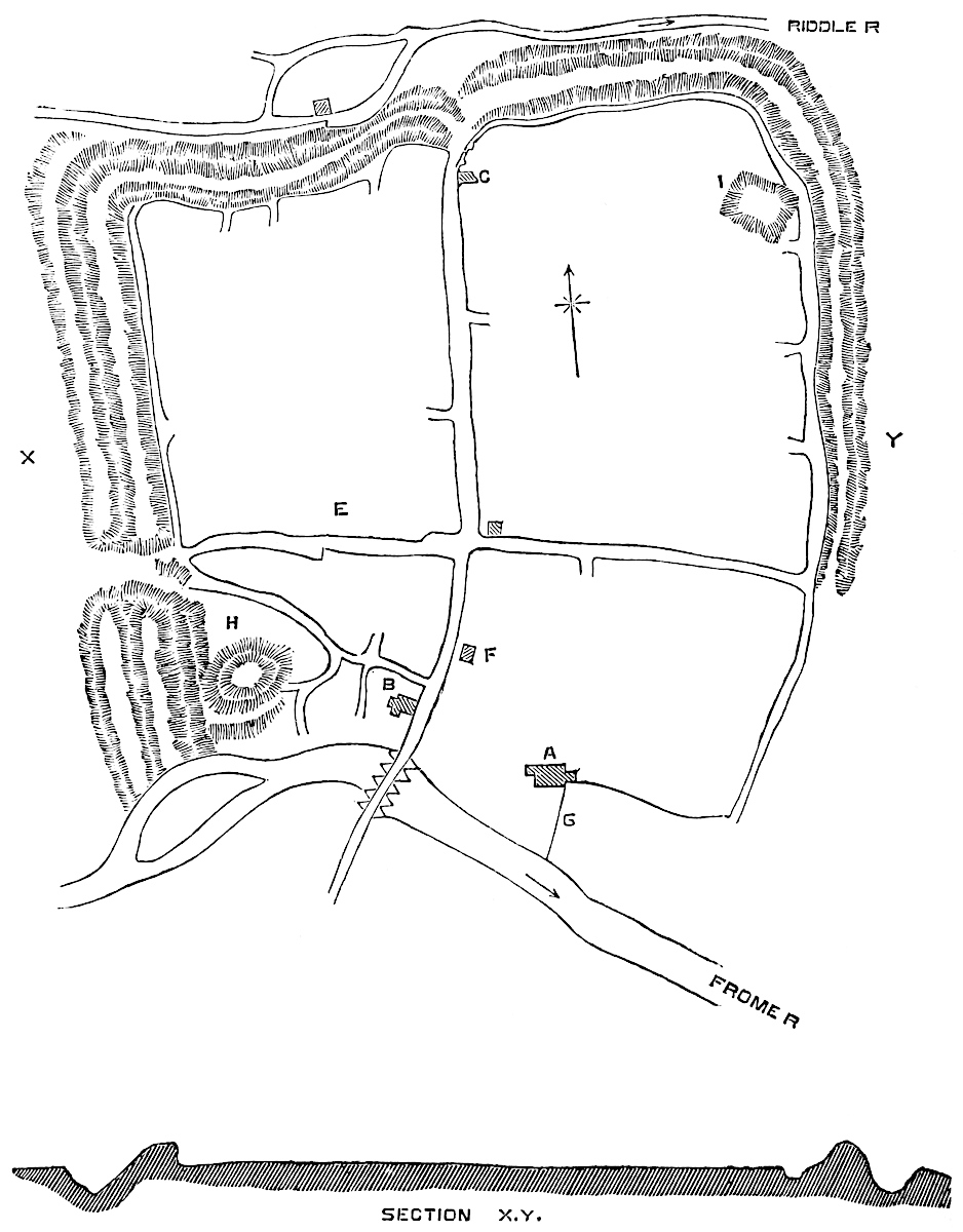 There is a great resemblance in position and plan between Wallingford and Tamworth and to some extent Cardiff, and Wareham. In each case the general earthwork is rectangular, of bold profile, and has a single ditch, and is placed near a river, and on that side unbanked. Each also has a mound towards the river, with its own proper defences, and upon each the Normans placed a shell keep. There is no evidence of Roman occupation of any of these516 places, though the road from Wareham to Dorchester may be Roman, and if the line of the Ackebury ditch from Sarum to Badbury were produced, it would pass close west of this place. Possibly the rectangular defences were the work of the Romanised Britons, the mound being an English addition of the ninth century. The work has never been known as a “Chester.”