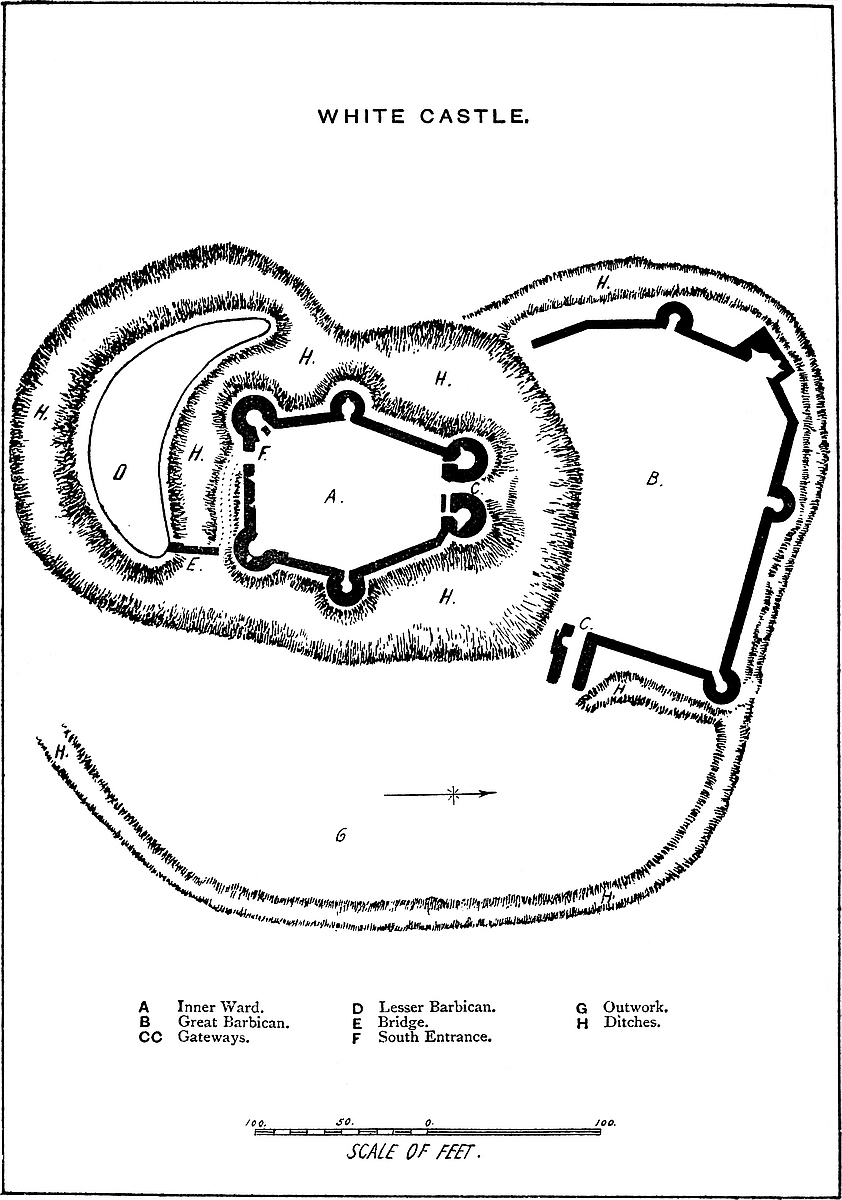 The name White Castle,—in Welsh, “Castell Gwyn,”—is said to be derived from Gwyn ap Gwaethvoed, a brother of the reputed founder of Skenfrith, and one of the Welsh lords of this district. If so, he must have held it during the troubles preceding and subsequent to the death of Harold, but any works that he may have found or thrown up were probably effaced by those of the present castle. The castle was held, with those of Grosmount and Skenfrith, sometimes by the De Breose family, sometimes by the Crown, and, finally, by the Dukes of Lancaster. No doubt it shared in the general neglect of the Border castles; that is, of such as were not the seat of any baronial family. In the time of James I. it was a ruin, and had been so beyond the memory of man.