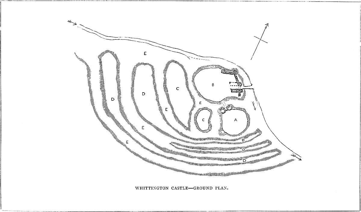 The position of Oswaldestre has already been described. Whittington lay about two miles to the north-east, and about four and a half miles within or to the east of Offa’s Dyke, while Watt’s Dyke522 extended between them. The site of Whittington was probably selected as the centre of a fertile estate, rather than for any very striking military advantages, for the position is low and marshy—a feature of which, however, the ancient engineer largely and judiciously availed himself. By whom or when the original fortress was founded is utterly unknown. Certainly long before its occupation by those Norman invaders, who identified it with their fame. As, like Shrewsbury, Clun, and Oswaldestre, its keep was placed upon a moated mound, its origin, like theirs, may probably be attributed to the reign of Edward the Elder, or the earlier part of the tenth century, and to the fierce Mercian Saxons, who, as early as the middle of the seventh century, seem to have established themselves along the Welsh border.