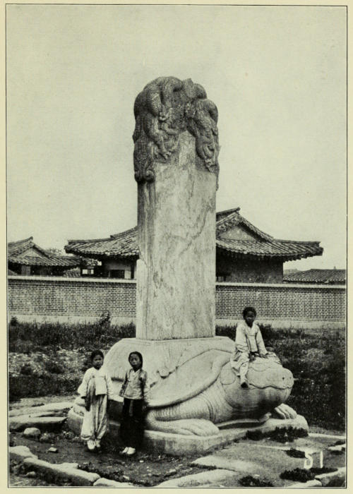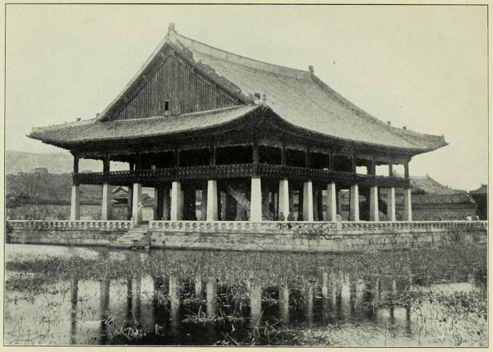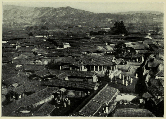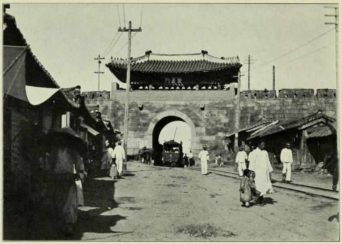 From the steamer’s deck our companion pointed out the eminence on which, according to the narrative written by a contemporary in Chinese (the book has never been translated and copies of the original are rare), the Korean Governor[16] of the District, when hunting in the early morning more than three centuries ago, looked out to sea and to his amazement saw myriads of foreign-looking boats filled with armed men approaching the bay. It was the army sent by Hideyoshi for the invasion of the peninsula. The Korean magistrate hastened to his official residence in the town, but scarcely had he arrived when the Japanese forces were upon him and had taken possession of everything. In twenty-one days the invaders were in Seoul. But according to the universal custom of the country when invaded, from whatever quarter and by whomsoever, the cowardly court—a motley horde of king, concubines, eunuchs, sorcerers, and idle officials—had fled; then a Korean mob burned and sacked the deserted palace and did what well could be done toward desolating the city. For seven years the Japanese held Southern Korea, even after their navy had been destroyed, so as to make it impossible to transport reinforcements sufficient to meet the combined forces of the Chinese and the Koreans. It was the fear of a similar experience which, centuries later, made them so careful first to incapacitate the Russian navy as a matter of supreme importance. On another low hill to the right, our attention was directed to the remnants of one of the forts built at the time by the invading Japanese; and further inland, the train ran near to traces of the wall which they erected for the defence of their last hold upon the conquered country. Even then “the people hated them with a hatred which is the legacy of centuries; but could not allege anything against them, admitting that they paid for all they got, molested no one, and were seldom seen outside the yamen gates.”