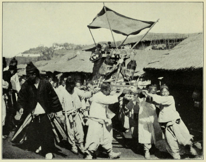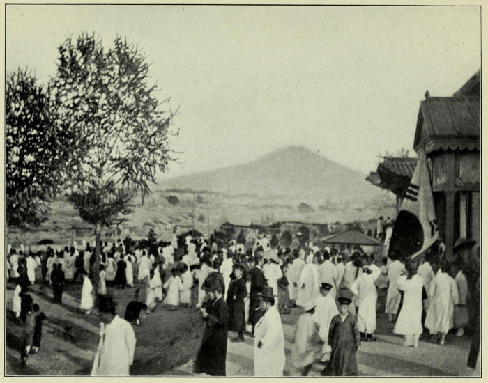 It was my intention at first to prepare for the work in Korea by much reading of books. But the professional and social demands made upon both time and strength, to the very last hour of our stay in Japan, prevented the carrying out of[11] this intention. When, later on, it became possible to read what had previously been published, I discovered that the deprivation was no hindrance, but perhaps a positive advantage, to the end of success in my task. A story of recent experiences of Korean intrigue which had already been reported to me in detail was of more practical value than the reading of many learned treatises. The story was as follows: Among the several representatives of American Christian and benevolent enterprises who have recently visited that country, for the size of his audiences and the warmth of his greeting, one had been particularly distinguished. At his first public address, some four thousand persons, men and boys (for the Korean women are never seen at such gatherings) had attempted to crowd into “Independence Hall.” Of these, however, nine-tenths came with the vague feeling that it is somehow for the political interest of Koreans to seem friendly to citizens of foreign Christian countries—especially of the United States—in order to secure help for themselves in an appeal to interfere with the Japanese administration. In this case the speaker was at first supposed to have great political influence. But the audience, seeing that the subjects of address were religious rather than political, fell off greatly on the second occasion. Meanwhile, some of the Korean officials, in order to win credit for themselves for procuring the audience, had falsely reported that the Korean Emperor wished to see this distinguished representative from America. But when they learned that application for the audience had been duly made, through the proper Japanese official, they came around again and, with many salaams and circuitous approaches, expressed the regrets of His Majesty that, being indisposed, he was unable to grant the audience which had been applied for. At the very time of this second falsehood, the proper official was in the act of making out the permit to enter the palace. The audience came off. And while the American[12] guest was in the waiting-room, the Minister of the Household, watching his chance to escape observation, with his hand upon his heart, appealed to the distinguished American for his nation’s sympathy against the oppression of the Japanese. During the two months of my own experience with the ways of the Koreans, all this, and much more of the same sort, was abundantly and frequently illustrated. And, indeed, no small portion of the recent movement toward Christianity is more a political than a religious affair. But of this I shall speak in detail later on.