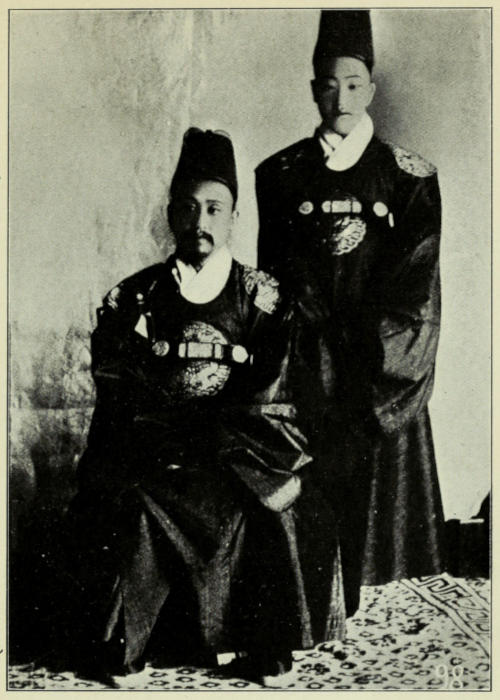 On the wharf at Fusan there were waiting to welcome us the local Resident, the manager of the Fusan-Seoul Railway, and other Japanese officials—all fine-looking men with an alert air and gentlemanly bearing. The official launch conveyed[17] us to the landing near the railway station, which is now some distance up the bay, but which will soon be brought down to the new wharf that is in process of building, in such good time that we had an hour and a half to spend before leaving for Seoul. Most of this time was improved in visiting a Korean school on the hillside just above. We were not, however, to see this educational institution at work, but only the empty school-rooms and several of the Korean and Japanese teachers. For the one hundred and seventy children of this school, clothed in holiday garments of various shades in green, pink, carmine, purple, yellow, and a few in white or black, were just starting for the station to give a “send-off” to Prince Eui Wha. This Prince is the second living son of the Korean Emperor and, in the event of the death or declared incapacity of the Crown Prince, the legitimate heir to the throne. There was much blowing of small trumpets and many unsuccessful attempts on the part of the teachers to get and keep the line in order, as the brilliantly colored procession moved down the hill.