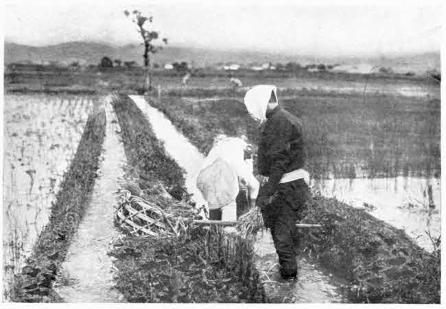 This entire district is an interesting example of the persistence in modern times of artisan and artist work, as done in humble houses by private individuals and families, with a certain independence and pride of craft, and on their own account as it were.[290] In and about this small and obscure village of Kuroé there are as many as one thousand houses in which work in lacquer is going on. Most of this work is, of course, of cheap and ordinary character; although some of the older forms of cheap utensils of lacquer have a certain artistic beauty. Other specimens of the work done to-day in these houses of the village and the adjoining fields may, however, well lay claim to a rather high order of merit. For if there is not much initiative or originality shown by the peasant workers, the designs of the celebrated Korin, made a century and a half ago, are still being faithfully and skilfully copied by them. But there surely was not much work done, whether in fields, shops, or houses, during the hours of our stay. For the people, of all sorts, ages, and sizes, were gathered in groups, with that mild-mannered and unabashed curiosity which characterises the old-fashioned country folk of Japan, to watch the doings of the strangers who had so suddenly and unexpectedly appeared within their borders.