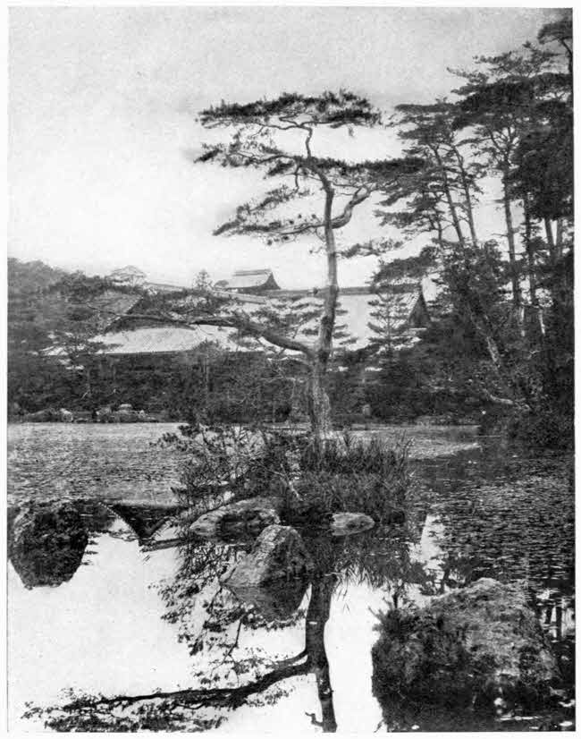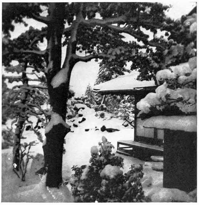 In the morning, when the room had been again prepared for its day-time uses, the beauty of its screens and other simple furnishings, painted in raised chrysanthemums by one of the Kano school, was made the more charming by the light reflected from the snow-covered ground and cloudy sky. The garden was a picture such as can be seen only in Japan; its tiny curved stone-bridge over an artificial pond, the dark green twisted pines, the stately mountains in the distance; and all covered with fresh-fallen snow—a landscape made dignified by nature and exquisite by man.