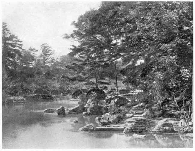 It is not quite possible for the most gifted master of the descriptive style to depict the charm of the first jinrikisha ride out into the country surrounding Kyoto. At least, the charm experienced by me on the occasion of this excursion will never be forgotten. The excellent road; the durable and handsome stone bridges; the continuous gardens and frequent villages; the perpetual stir along the highway, with the multitude of jinrikishas and two-wheeled carts,—some drawn by men and boys, and some by bulls, mostly black,—or of foot-passengers, coming into the city on business or going into the country bent on pleasure;—all these made the entire journey exceedingly lively and interesting. Further out, in the more solitary places, were the terraces covered with verdure and flowers, the hills carpeted with what[30] looked like large and luxurious ferns, but which really was “mountain grass,” and the water-falls; but perhaps most beautiful of all, the bamboo groves, whose slender trunks and delicate foliage threw a matchless chiaroscuro upon the brilliantly coloured ground below. Here was indeed a genuine chiaroscuro; for the parts in shadow had “the clearness and warmth of those in light, and those in light the depth and softness of those in shadow.”