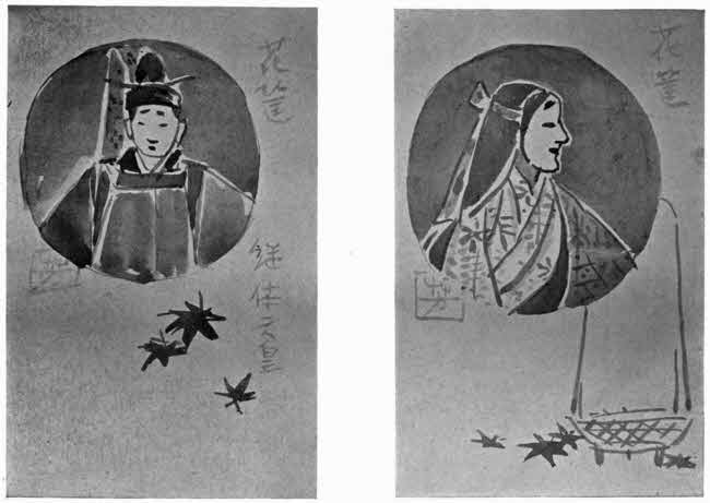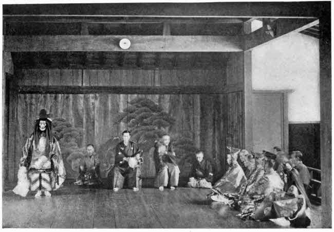 After the supper we were led to the large audience-hall of the former villa, where all the shoji were plain gold-leaf and the ceilings chastely but beautifully panelled; here we were fairly compelled to sit in the throne-like chairs on the raised alcove, which was in feudal times reserved exclusively for the lord of the clan. The cold made the combined efforts at heating of a modern oil-stove at the back, with antique hibachi on either hand, by no means ungrateful. Beside each of the guests knelt an interpreter,[274] who was to announce the different numbers and translate their comments on the music; while all the hosts sat ranged along the other side of the hall, native fashion on the floor. Thus a somewhat weird but vivid and interesting picture, reminiscent of the older times, was made by this large and dimly lighted baronial hall, in which the lord of Hikoné may well enough himself have listened to some of the same music which was played for us. The first number on the programme proved to be a selection of the oldest style of Japanese concerted music; it was played on three different kinds of flute by three young men, all dressed in dark silk kimonos and in head-dress of two hundred years ago. Then two pretty girls, beautifully gowned and with faces powdered and lips tinted vermillion and gold,—the ancient manner of decoration in such cases,—together with their teachers, played a Spring “nocturne” on three Kotos, or Japanese harps. Other selections followed; and the concert closed with a queer fugue-like performance on Chinese flutes—one short and the other a full yard long, but both gaily decorated with silken cords and tassels.
