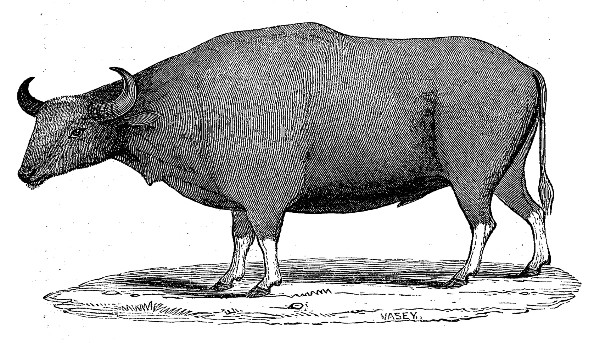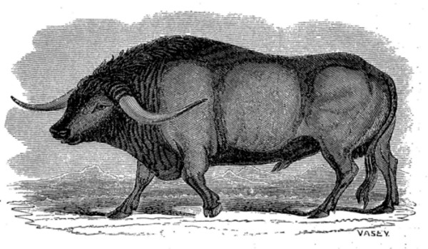"Sub-genus III.—Taurus.—Forehead square from the orbits to the occipital crest, somewhat concave, not convex, or arched as in the former; the horns rising from the sides of the salient edge or crest of the frontals; the plane of the occiput forming an acute angle with the frontal, and of quadrangular form; the curve of the horns outwards, upwards, and forwards; no mane; a deep dewlap; thirteen pairs of ribs; tail long; udder four teats in a square."