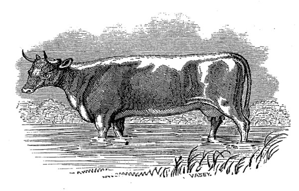 An ordinary Cow, and a Bull without horns, will produce a calf resembling the male in appearance and character, without horns and without that particular prominence of the transverse apophysis of the frontal bone. The milk of the female from this cross, also, proves the influence of the male: it has the peculiar qualities of the hornless breed—less abundant, containing less whey, but more cream and curd.