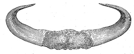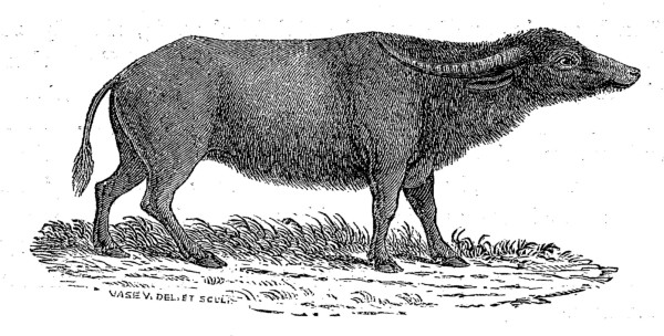 "Sub-genus I.—Bubalus.—Animals low in proportion to their bulk; limbs very solid; head large, forehead narrow, very strong, convex; chaffron straight; muzzle square, horns lying flat, or bending laterally with a certain direction to the rear; eyes large; ears mostly funnel-shaped; no hunch; a small dewlap; female udder with four mammæ; tail long; slender."