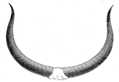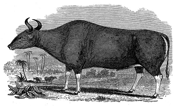 The above figure was drawn from a stuffed specimen in the British Museum. In colour, shape, and texture of horns, and apparent want of dewlap, it bears some resemblance to the Gaur; but in the skeleton of the Gaur the sacrum consists of five vertebræ, and the tail of nineteen; while in the skeleton of the Banteng, the sacrum consists of but four vertebræ, and the tail of eighteen.[Pg 186]