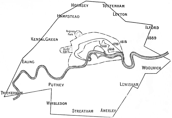The diagram (p. 23) shows the growth of London between 1560 and 1889. The notable features being (a)24 the very rapid extension of the London area since 1815, and (b) the fact that the marshy land south of the Thames has only been covered with buildings within comparatively recent times. The frontispiece is a reproduction of part of Newcourt’s map (1658) showing that the houses in the centre of London were very densely packed. It also shows the position of Moorfields, and the Drapers’ Garden, which are alluded to in the text.
