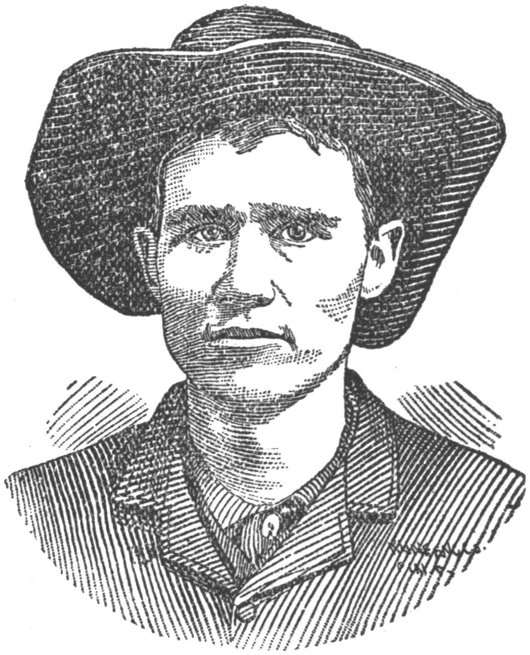 Rube Burrow’s old companions in Alabama recall distinctly the day he left Lamar County for Texas in the autumn of 1872. He left the old and familiar scenes of his boyhood, full of hope and eager to test the possibilities that Texas, then the Eldorado of the southern emigrant, opened up to him. He was but eighteen years of age when he took up his abode with his uncle, Joel Burrow, a very worthy and upright man, who owned and tilled a small farm in Erath County, that State. In 1876 Rube was joined by Jim Burrow, his younger brother, who remained in Texas until 1880, when, returning to Lamar County, Alabama, he married and resided there until 1884, when he rejoined his brother Rube in Texas, taking his wife thither. Jim Burrow was a “burly, roaring, roistering blade,” six feet tall, as straight as an Indian, which race of people he very closely resembled, with his beardless face, his high cheek bones and coal-black hair. He was in every way fitted for9 following the fortunes of Rube, and had he not succumbed to the unhappy fate of imprisonment and early death he would have been a formidable rival of his brother Rube in the events that marked his subsequent career.