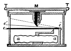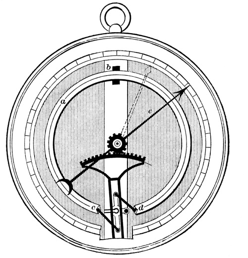 It is with the last of these instruments that we are especially concerned in the present essay. It has two quite distinct uses: One to indicate the varying pressures of the air at some fixed point for meteorological purposes, and the other to indicate difference in altitude of points to which the instrument is carried by affording a measure of the greater or less amount of atmosphere above it. Before using the instrument to measure altitudes it is important to become somewhat familiar with its use as a stationary instrument. The [Pg 8] barometer most frequently employed for such use is the one invented by Toricelli in 1643. It is too well known to require description here. It will be sufficient to say that it measures the varying pressure of the air by the varying length of a column of mercury which balances the pressure.