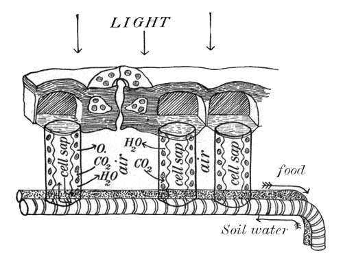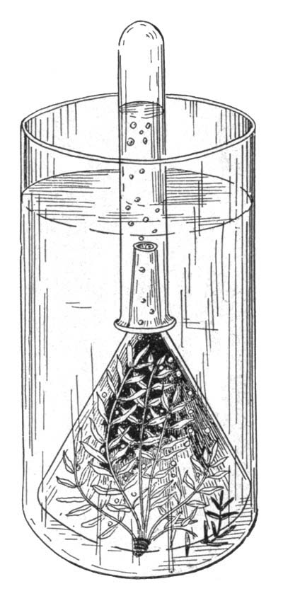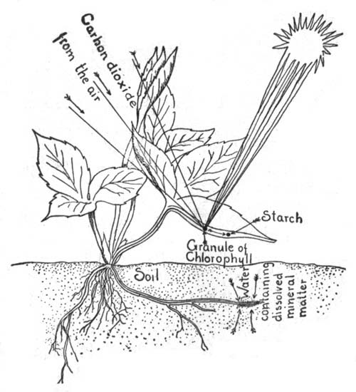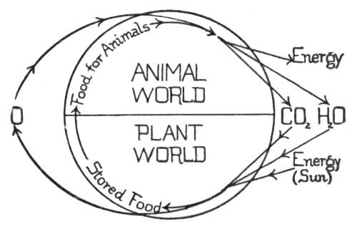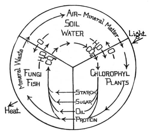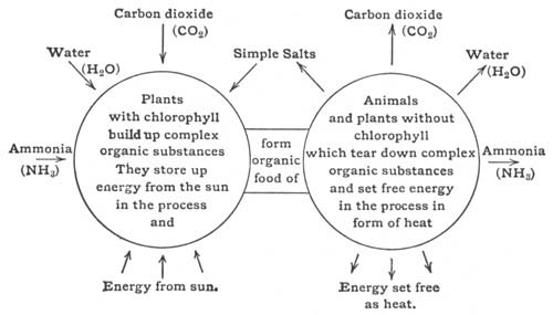 [Pg 18]Plants and Animals mutually Helpful.—Most plants and animals stand in an attitude of mutual helpfulness to one another, plants providing food and shelter for animals; animals giving off waste materials useful to plants in the making of food. We also learn that plants and animals need the same conditions in their surroundings in order to live: water, air, food, a favorable temperature, and usually light. The life processes of both plants and animals are essentially the same, and the living matter of a tree is as much alive as is the living matter in a fish, a dog, or a man.