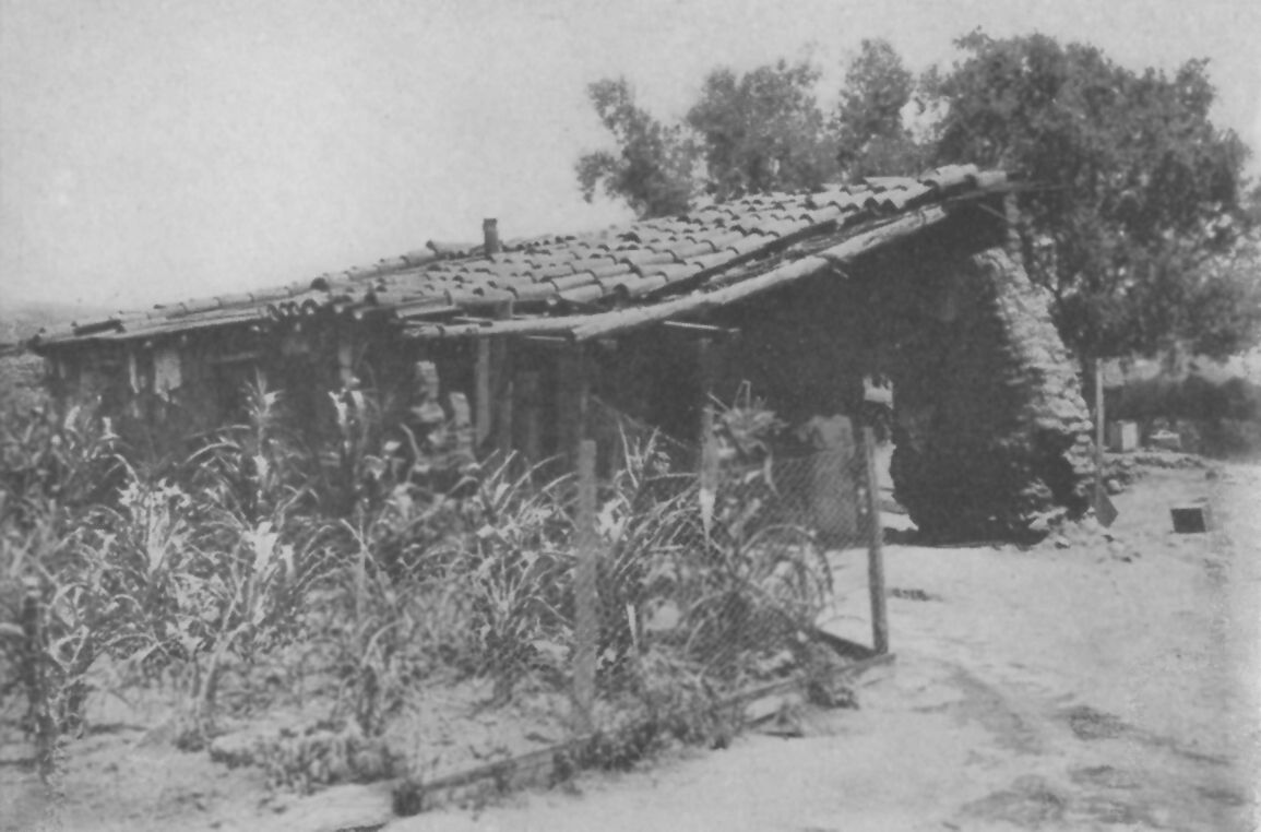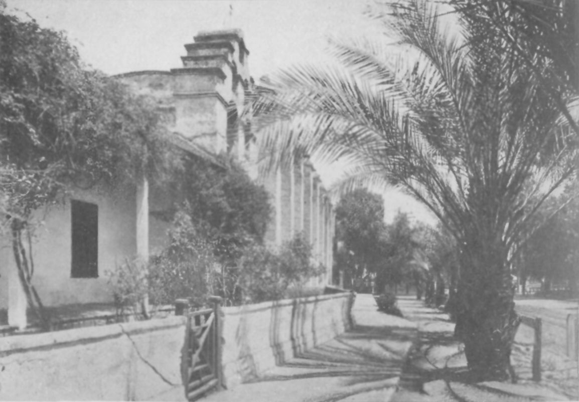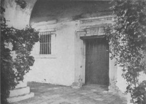 At San Juan Capistrano, on the east side of the quadrangle, in the northeast corner, is a small room; and in one corner of this is a niche for a statue, the original decorations therein still remaining. It is weather-stained, and the rain has washed the adobe in streaks over some of it; yet it is interesting. It consists of a rude checkerboard design, or, rather, of a diagonal lozenge pattern in reds and yellows.