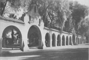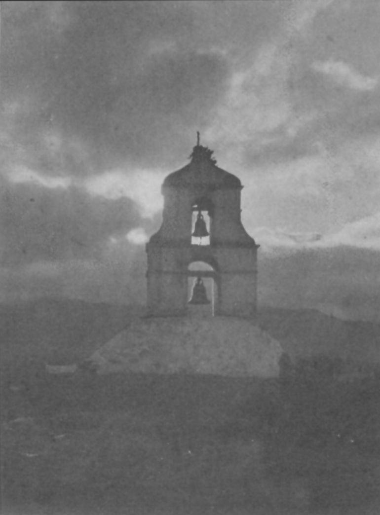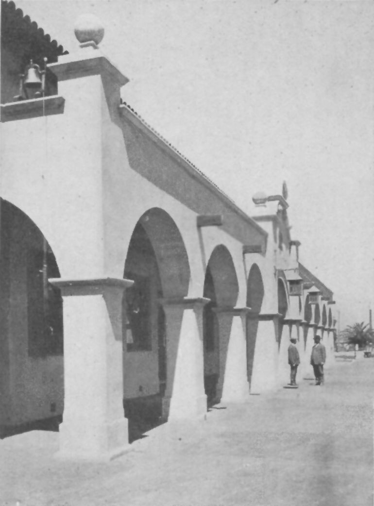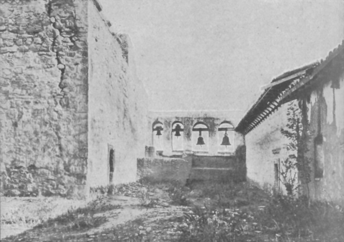 The walls throughout are massive and unbroken by any other lines than those of doors, windows and eaves, and the roofs are covered with red tiles. In the Bell Tower a fine chime of bells is placed the playing of which at noon and sunset recalls the matins and vespers of the Mission days.