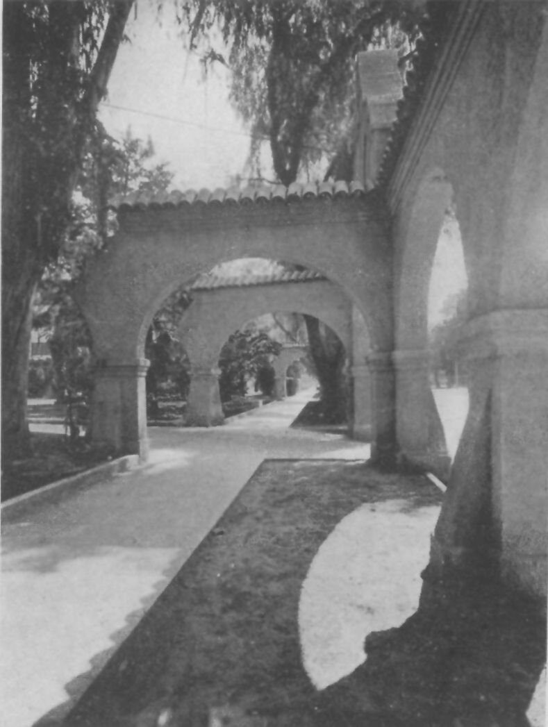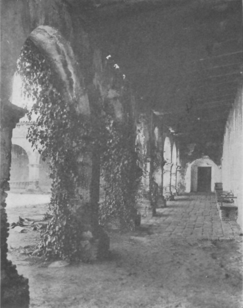 By the side of the Music Room is the Cloistered Walk, divided into sections, in each of which some distinctive epoch or feature of Mission history is represented by mural paintings by modern artists of skill and power. The floor is paved with tiles from one of the abandoned Missions.